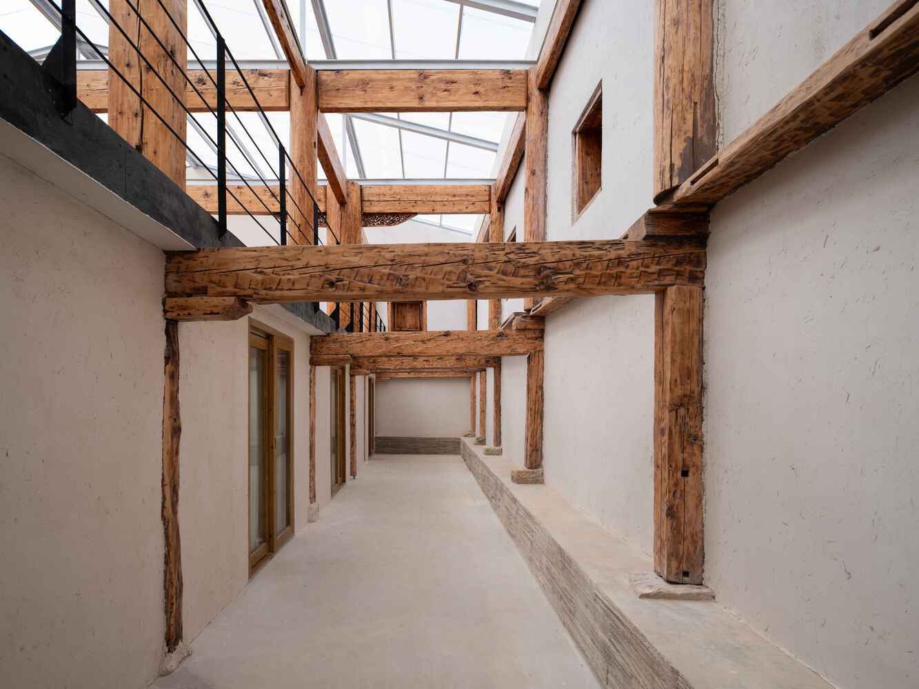 “Performative”,即“管用”,是这个改造项目的基本立场。主体木结构完好,那就尽量保留;夯土墙能遮蔽风雨,其热工性能优越,那就把破损坍塌的地方修补一下也保留下来;屋顶已经损毁,传统的“木闪片”屋顶体系也已经被时代抛弃,那也不必多愁善感,用一个新的体系来替代它。