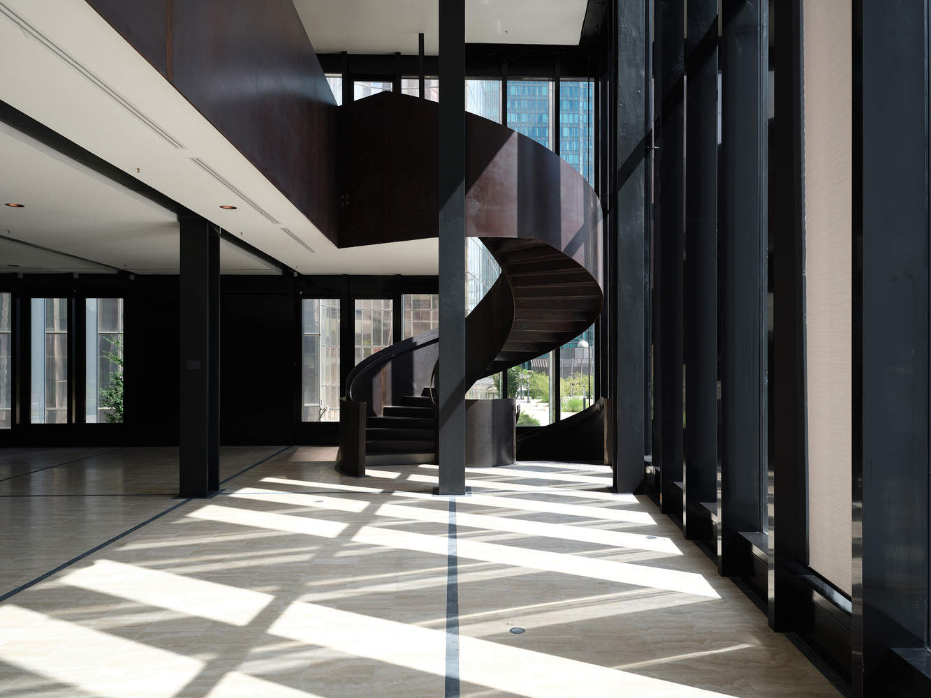 变形 - 大楼如同一件珍贵的玻璃艺术品,日间反射光线,夜间通透明亮。环绕建筑的竖向磨砂玻璃百叶既是光的过滤器,也是建筑与使用者的屏障。这层“有机表皮”在一天之中随着光影变化,或增强或柔化光线,使建筑在以办公楼为主的区域内形成独特的亲密感。立面百叶的韵律在建筑转角处展现出最大的可能性。然而,Aurore 大楼并不受限于严格的直角构造,每个转角都承载着独特的意义:有的向前探出,有的内收,有的作为最长立面的断点,同时建筑还通过三层城市平台(slabs)与周围环境建立联系。这座建筑是真正的“生命建筑”,其有机特性不仅体现在形式上,更体现在功能上。公众可以自由穿行于 Aurore 大楼内外,从环形步道通向屋顶,从鸢尾广场步入倒影广场(Place des Reflets),或进入 Aurore 大楼的接待大厅。一条内部街道作为倒影广场的延伸,串联起塔楼与曙光馆,加强了空间的流动性。这种全新的通行方式打破了拉德芳斯最初的设计——即将环形步道与步行广场割裂的封闭模式。