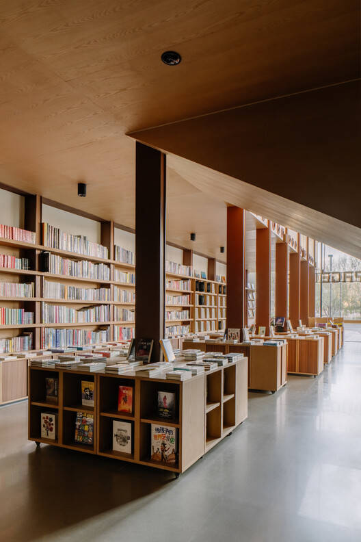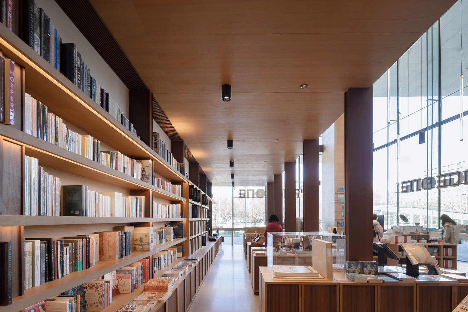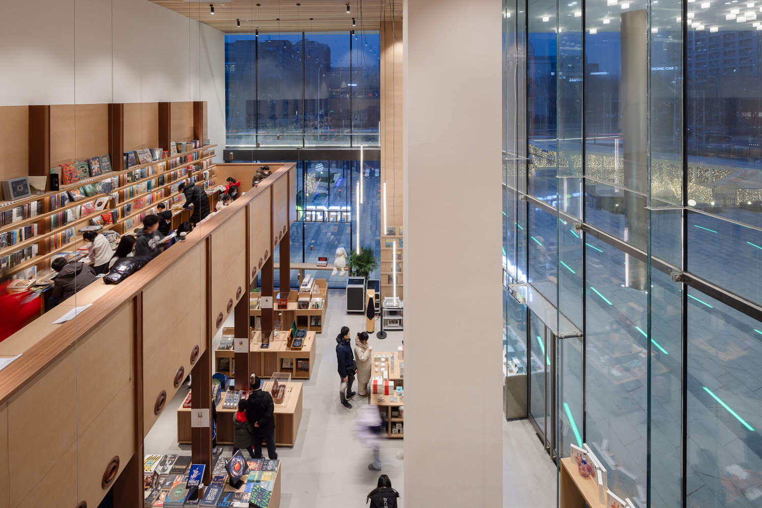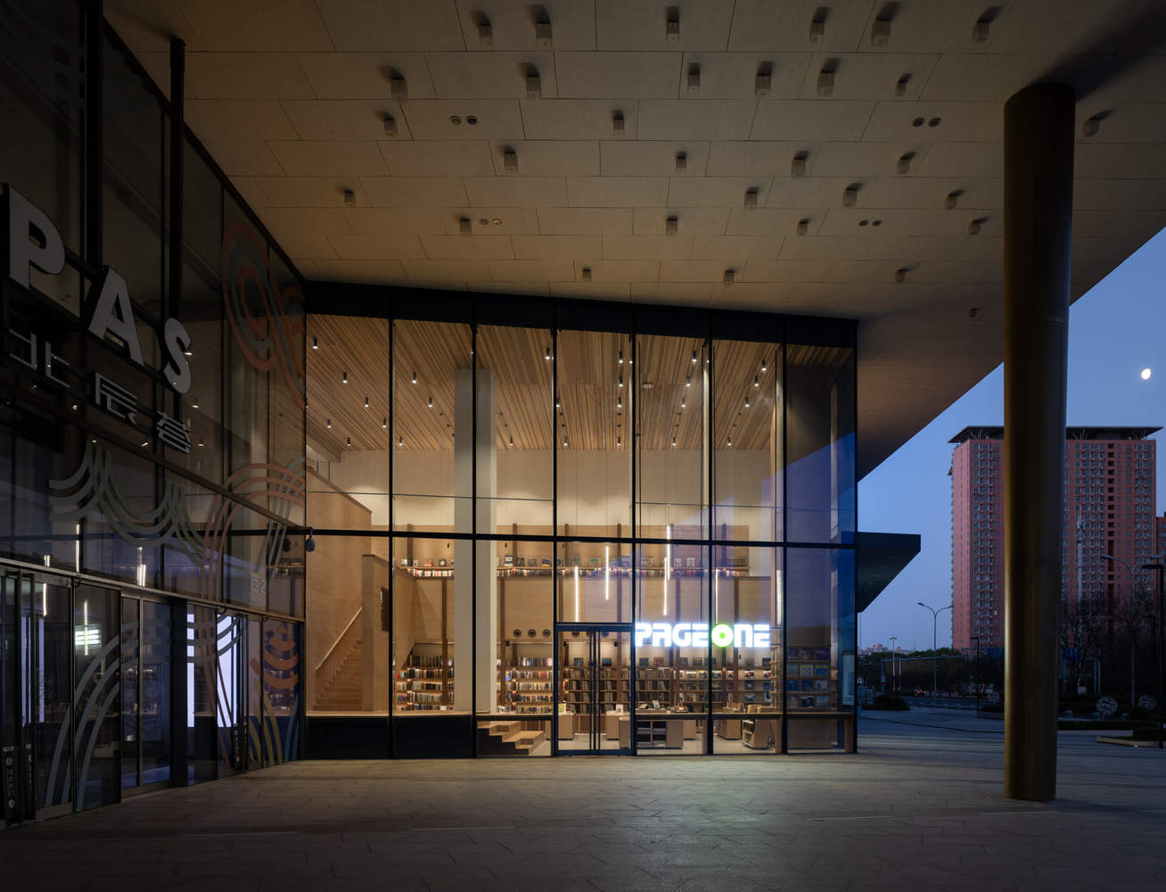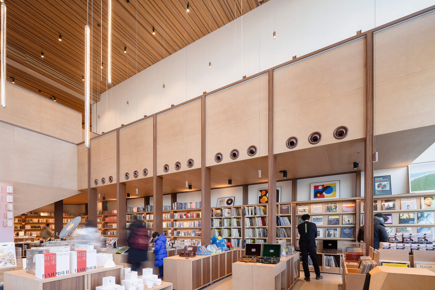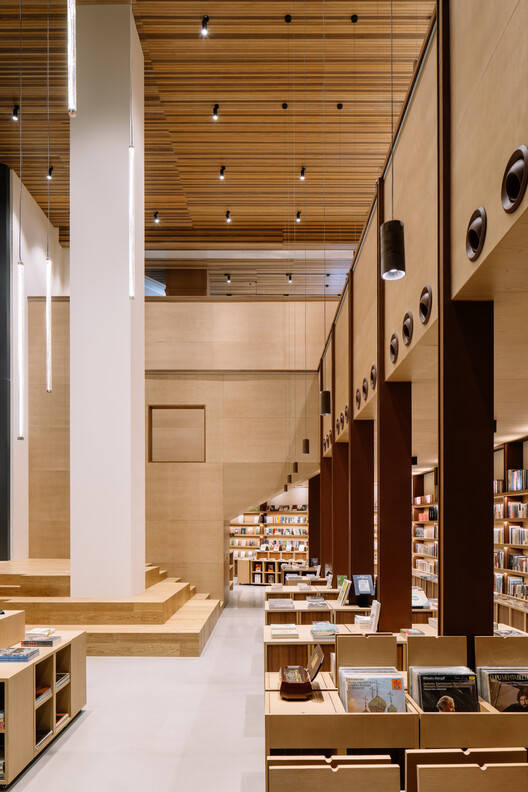 From the architect. PAGEONE Beichen Hui is located within the Olympic Forest Park in Chaoyang District, Beijing. Unlike the traditional mode of reading physical books as the main experience, the new store space attempts to integrate new senses, using the concept of vinyl records as the environment and content theme, and hopes to create a different way of understanding and interacting with the space, extracting the accumulated stories of music into a new consciousness image of the bookstore.