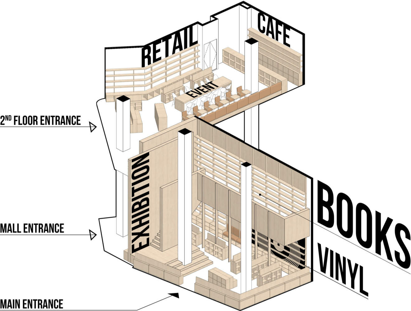 The main entrance of the bookstore is located near the street and opens up to the main outdoor space of the building, connecting to the main event and gathering places of the first floor bookstore, allowing the open high reading space to fully embrace the natural atmosphere. Stacked books, vinyl records, people sitting around reading experience. When there is an event, the record rack and bookshelf can be folded and moved, changing the layout, reading sharing sessions, vinyl music concerts, extending street community life into the bookstore room.