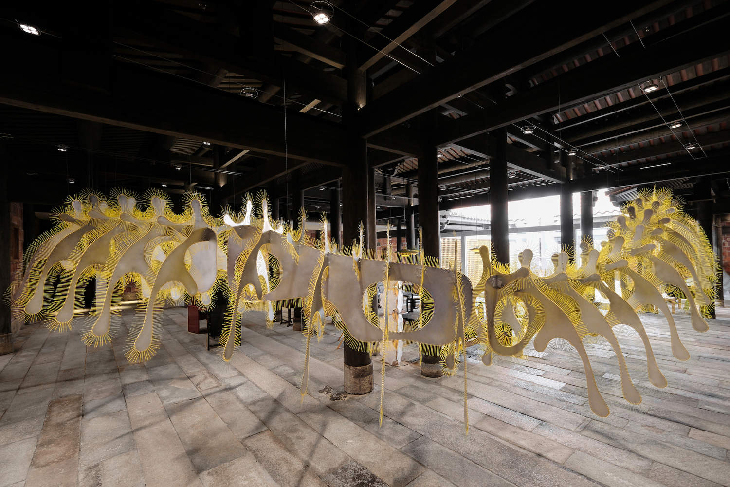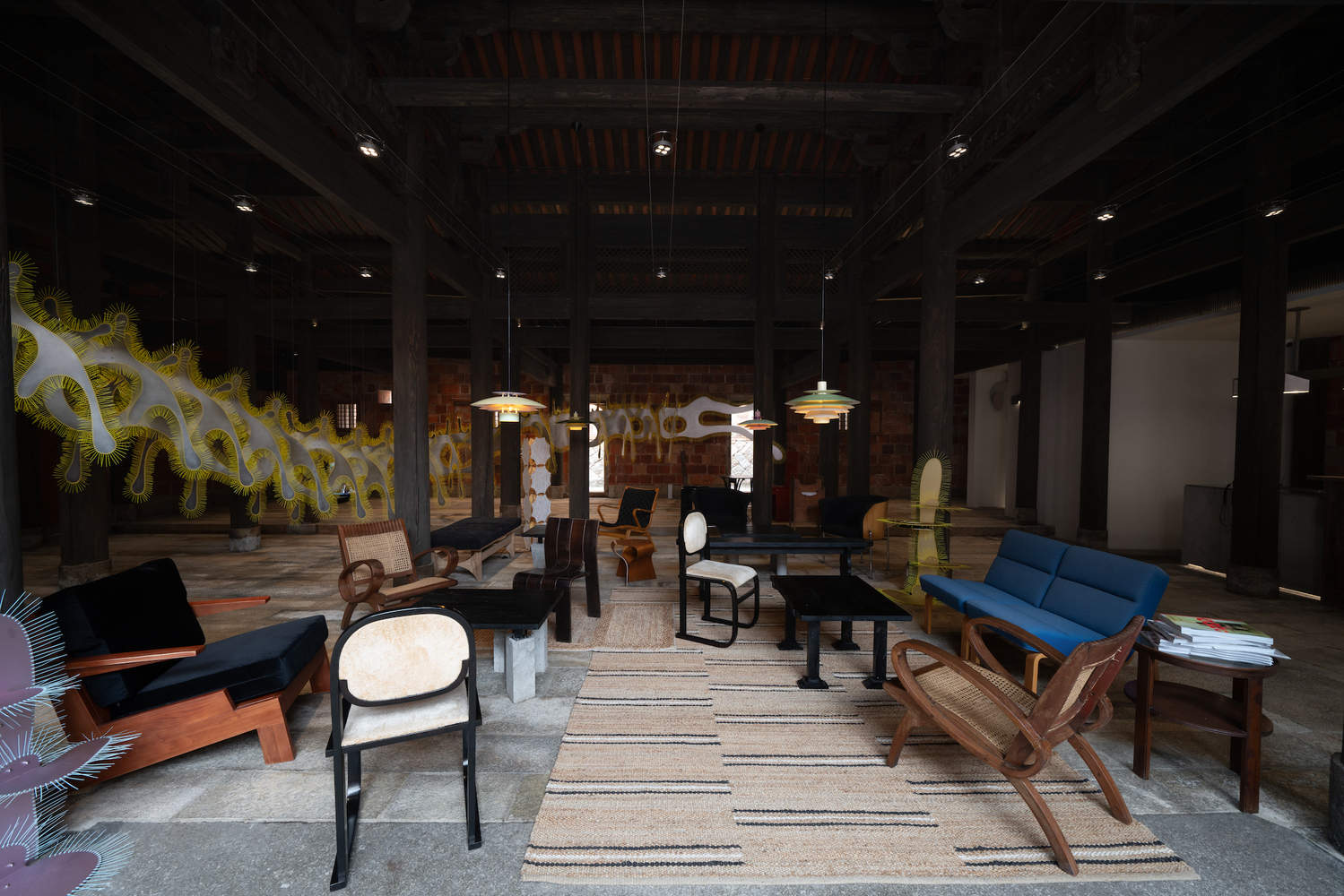 同时,在这个LANLANLI,我们希望艺术是被用来解析这个独特的空间,不是仅将空间作为容器,而是和空间发生关系。因此它区别于一般展览,DEVOLUTION退化建筑此次邀请了envy envy、File Studio和PAPAPAPARTNER三个小而有创造性的创作团队,在闽南大厝中创作了一件名叫“枢核”的作品,它是一个空间装置,破坏和重构了传统木结构建筑的制式感受,是这个闽南古建筑的一种新的情境生成。「SITUASIAN」也在这个项目中融入了在地色彩,在整套视觉设计中上汲取了泉州建筑中剪瓷材料的高饱和度对撞色,在“俗而有力”中生成当代的语汇。