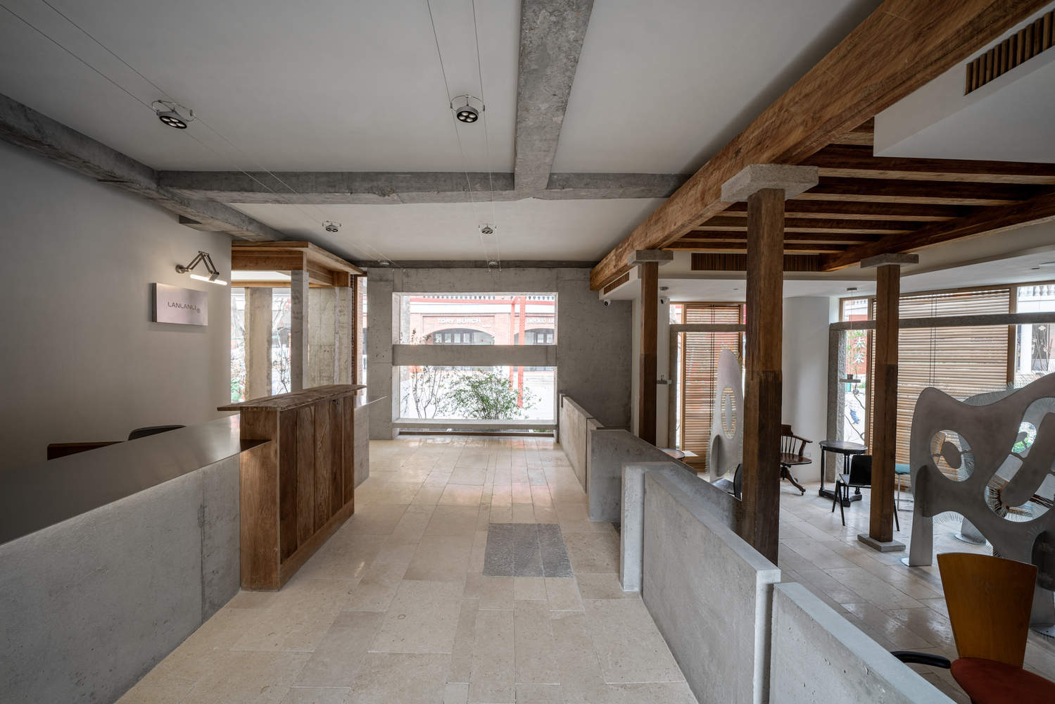 此次设计基于两栋不同时期的闽南建筑(传统古厝与1980年代红砖楼)进行改造,在保留和整理传统建筑语言的基础上,DEVOLUTION退化建筑通过克制的元素处理和介入——混凝土体块和温润的野生柚木及泉州白石的拼贴;南洋桌椅和1970-80年代的现代主义家具与灯饰的交互等,让这个空间既传统质朴又不乏摩登,闪现一些碰撞的趣味。