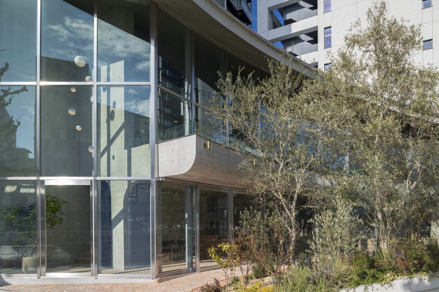 建筑主体退离街道,以一道弧线围合出一方葱郁庭院,其中种有橄榄林。建筑师将此处描述为城市中的“留白空间” —— 它象征着片刻的宁静,以光、自然与材质营造的有机韵律,在视觉上柔化了周遭密集的城市景观。