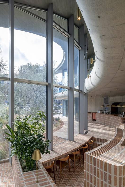 In the indoor area, a baking workshop, kitchen, and bar counter are set up around the concrete and brick curves on the first floor; The second floor is connected to the olive orchard through large windows, providing a wide view. Under the curvature of the three-and-a-half-story roof, there is a bar area that overlooks the scattered buildings below and provides a brief glimpse of the city scenery. Each floor is connected by a raised atrium, enhancing the openness and connectivity of the space.