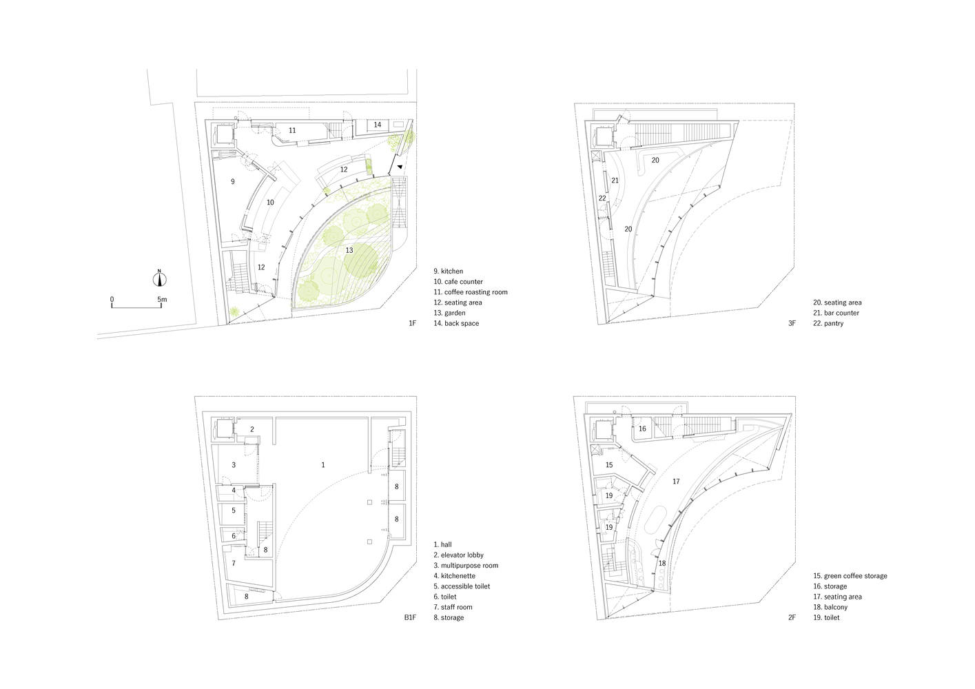 对于永山祐子建筑设计事务所而言,该项目始于一个简单的要求 —— 在公司新址打造一个面向公众的空间。秉持以社区为核心、提升公共领域品质的理念,这家日本事务所决定将日常咖啡仪式融入空间与材质的表达之中,打造出一个既轻盈又沉稳的建筑体。外部庭院是一个下沉式开放围合空间,位于多功能厅上方。乍一看,它巧妙地展现了 AOI CELESTIE 咖啡烘焙坊的三大层次。
