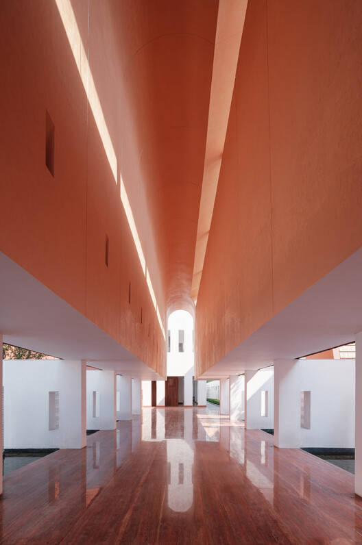 酒店中的核心功能,大体量的众多宴会厅被高效集约布置。宴会厅统一被大尺度的斜坡屋顶覆盖,这些斜坡顶的檐口高度统一被降到 2350mm 的近人尺度,形成的廊道空间便自然串联起了所有的宴会厅。这些廊道和其他建筑单体之间,被大面积的水景相隔,宾客在廊道内行走,低矮的檐口便框出了一幅幅巨大的水景长卷,人在卷中走,步移景异。