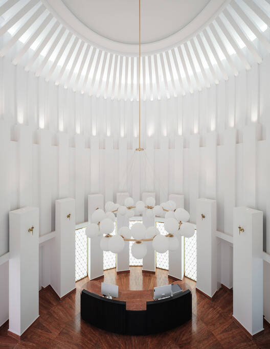 入口一侧的接待中心看起像是树林中的一座白色谷仓,漂浮在水面之上,只有通过主廊道方可以到达。在迎着客人的山墙面巨大的开口中,一座弧形的桥梁,从水上划过。客人从接待中心的一楼大厅可以通过这座桥到达二楼的艺术展厅。