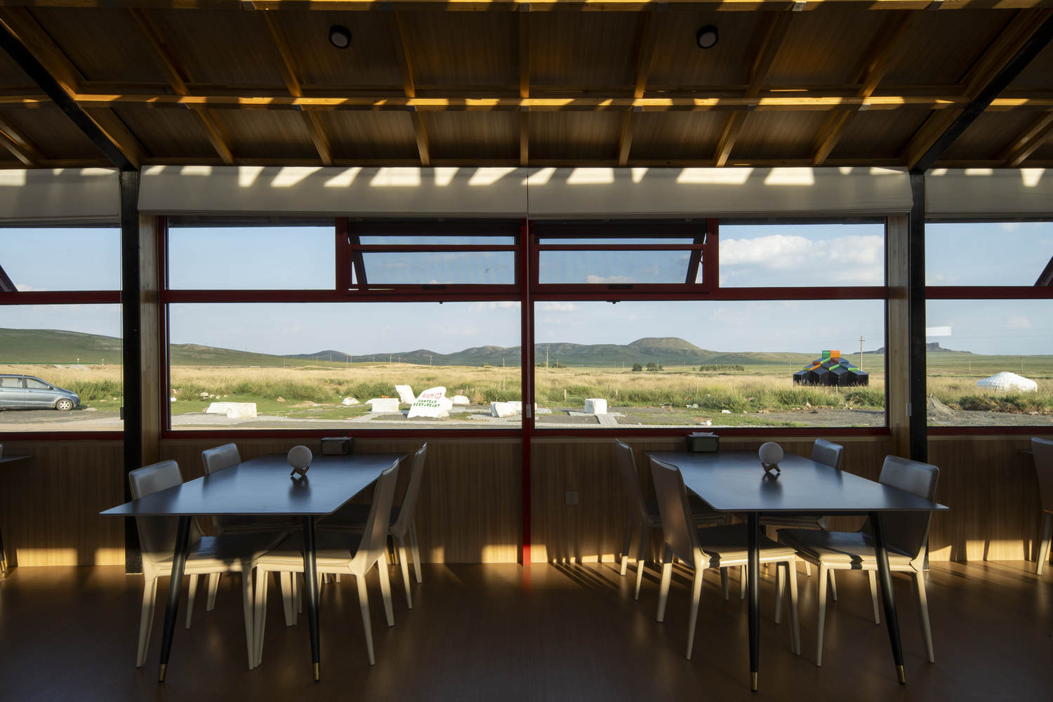杆式蒙古包体系的创新与实践:“杆式蒙古包”体系是该项目的亮点和核心。它不仅仅是对传统蒙古包形式的简单模仿,而是结合现代技术和材料,对传统智慧的创新性转化。该体系实现了建筑的模块化设计,可以根据不同的功能需求进行自由组合和重组,从而创造出多样的弹性空间。在餐饮区的设计中,该体系被用于塑造长方形的公共空间,充分利用了其建造逻辑和装配技术,从而缩短了施工周期,降低了成本,并确保了空间的品质和保温性能。此外,项目还大量采用了当地环保材料,体现了对可持续发展的承诺。