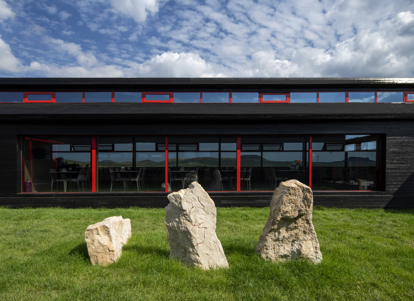 Catering area - public space derived from pole style yurts: The project effectively utilizes the construction logic and appropriate assembly techniques of the pole style yurt system to shape rectangular public spaces. In order to cope with climate characteristics, a cross sloping roof with high side windows is adopted to ensure ventilation, drainage, and snow removal functions. The material selection includes locally environmentally friendly materials such as integrated wood, burnt wood, volcanic stone, and recyclable materials, which reduce energy consumption, lower building material costs, and transportation costs. Suitable assembly techniques shorten the construction period, reduce construction costs, while ensuring space quality and insulation performance, and improving the energy utilization efficiency of buildings.