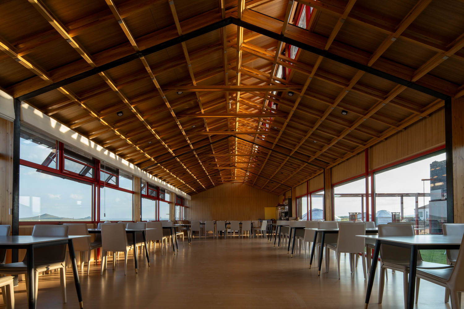餐饮区——杆式蒙古包衍生的公共空间:项目有效地利用杆式蒙古包体系的建造逻辑与装配适宜技术,塑造了长方形的公共空间。为了应对气候特征,采用交叉双坡屋顶,设置高侧窗,确保了通风、排水、排雪的功能。材料选用集成木和火烧木、火山石等在地环保材料和可循环利用材料,减少了能源消耗,降低了建筑材料成本和运输成本。装配适宜技术缩短施工周期,降低施工成本,同时确保了空间品质和保温隔热性能,提高建筑的能源利用效率。
