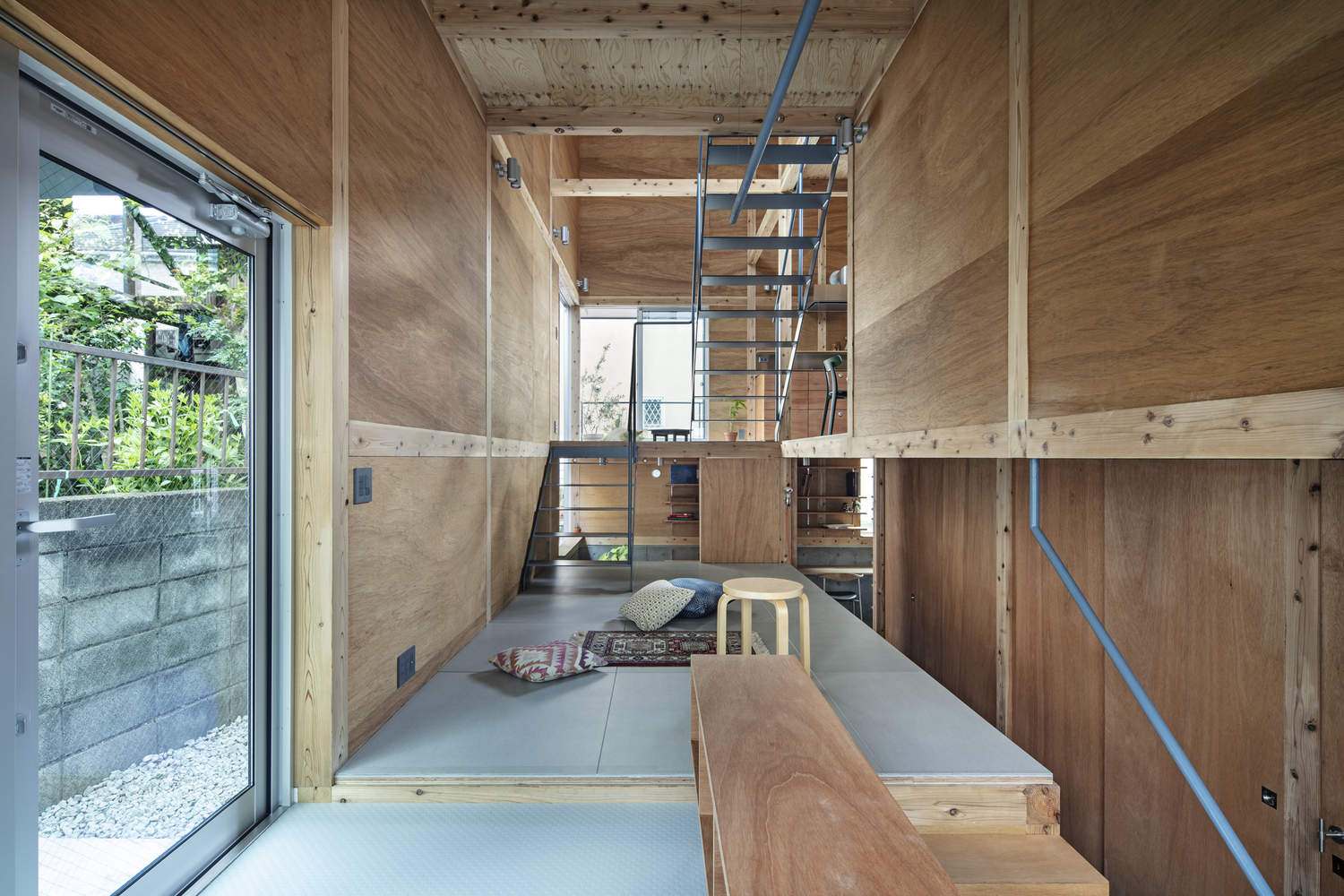 建筑结构以网格布局为基础,但部分柱子被刻意省略,梁体错落布置,以此营造空间上的连贯性与统一感。整座住宅由五个半层构成,从半地下室到屋顶层,通过一条垂直交通动线相互连通。因各楼层高度差异而形成的视线落差,造就了多个小型居住区域,而这些区域间的界限则引发了诸如席地而坐或倚靠等身体活动,共同构筑出丰富多元的生活场景。