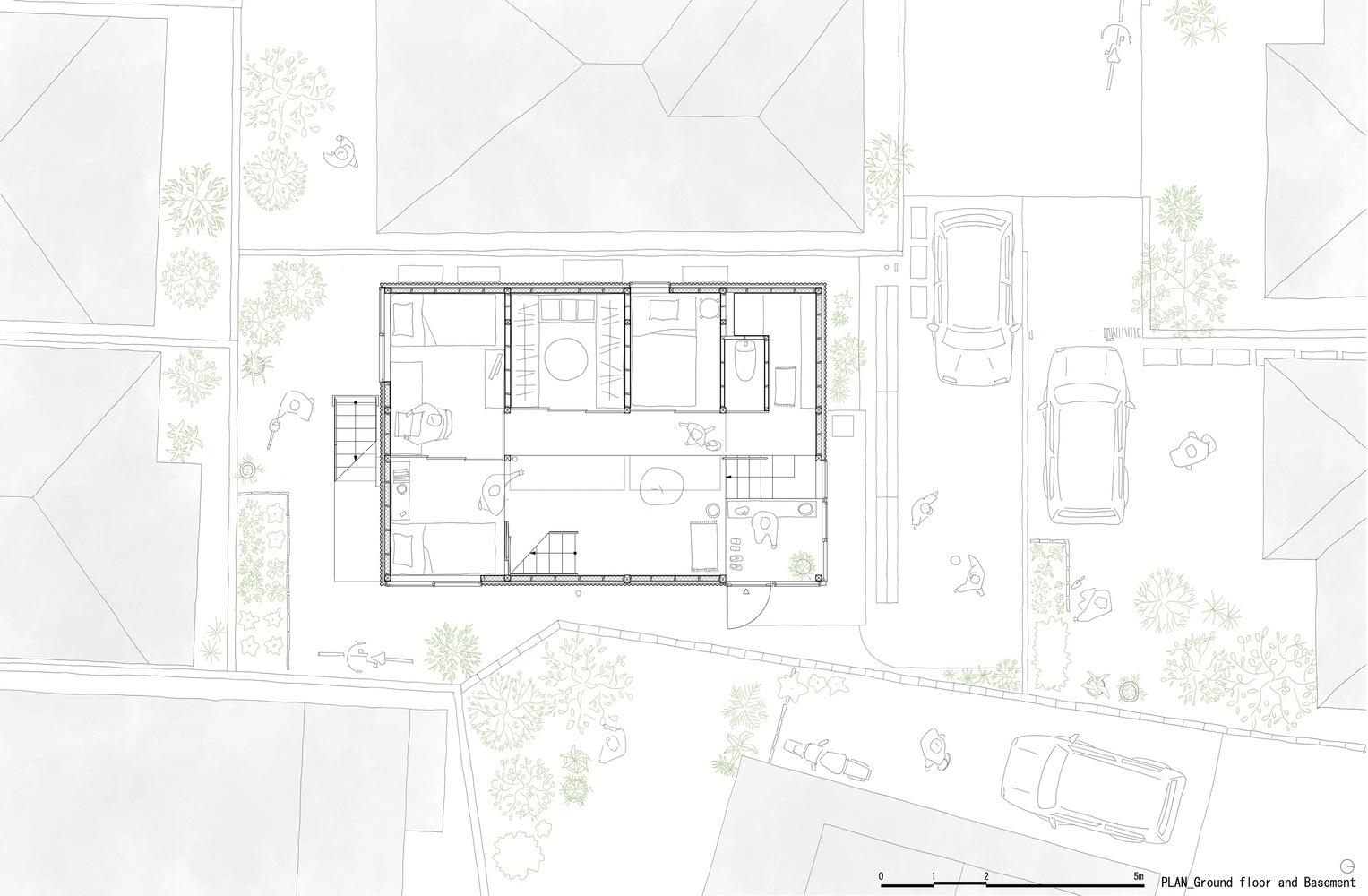 This 112 square meter residence is designed for a family of six with three generations living together. The site is located at the end of a dead end road, surrounded by independent residential buildings. It is situated in a densely populated residential area by the seaside, with a bright and pleasant atmosphere. This project involves the reconstruction of the original residence (previously inhabited by grandparents) to create a new home for the whole family to live in: the younger generation of three living together with the older generation of three. A young couple runs a hair salon near their home, and their children spend most of their time with their grandparents. The older generation sometimes work from home and sometimes work in cities. These six family members have different lifestyles and complex relationships with each other.
