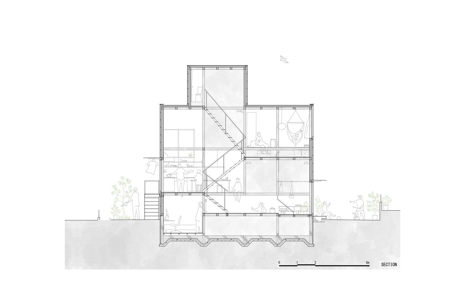 The building structure is based on a grid layout, but some columns are deliberately omitted and beams are arranged in a staggered manner to create spatial coherence and unity. The entire residence consists of five and a half floors, connected by a vertical traffic line from the semi basement to the roof level. The visual differences caused by the height differences of each floor have created multiple small residential areas, and the boundaries between these areas have triggered physical activities such as sitting or leaning on the ground, jointly constructing rich and diverse living scenes.
