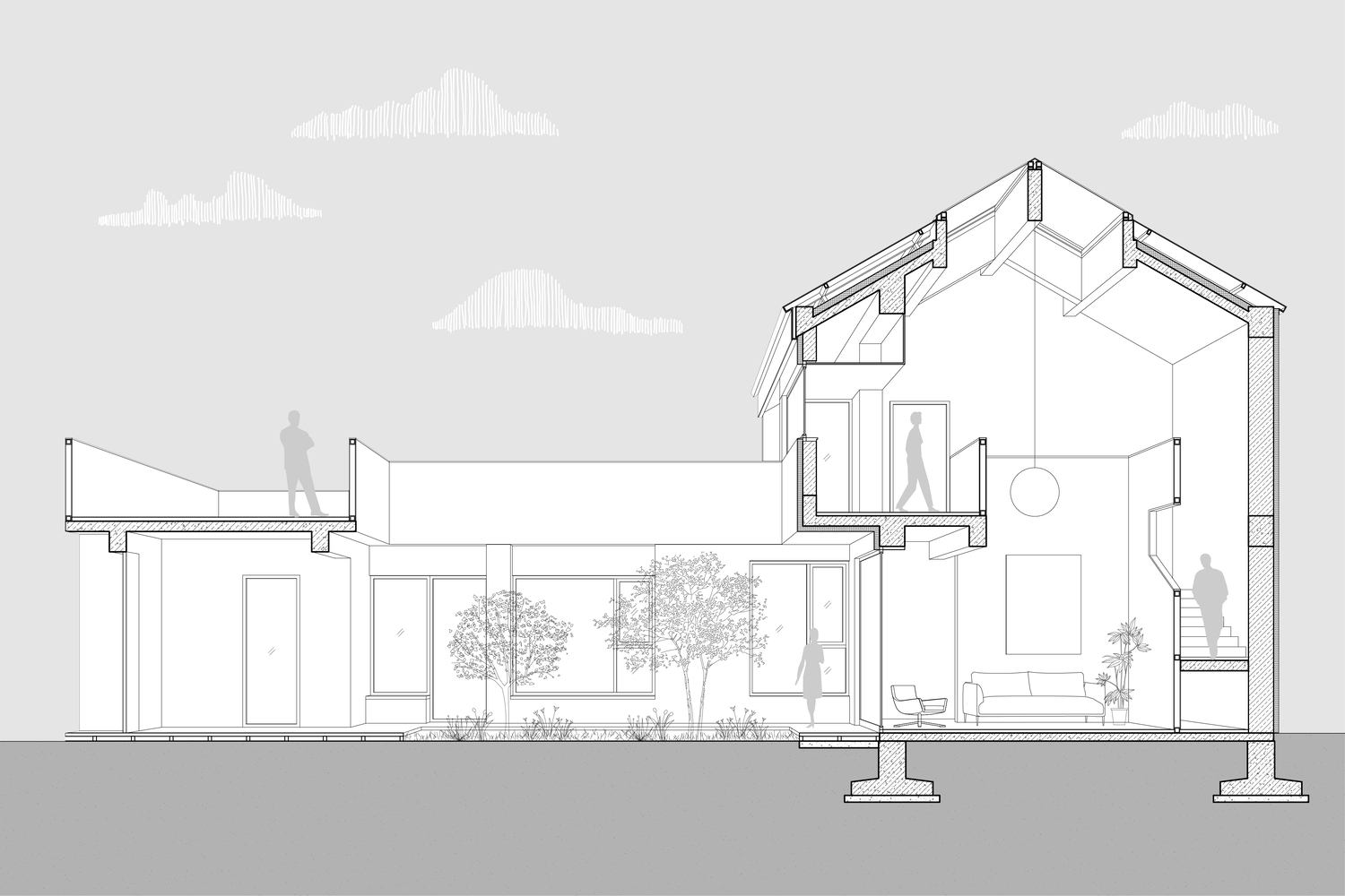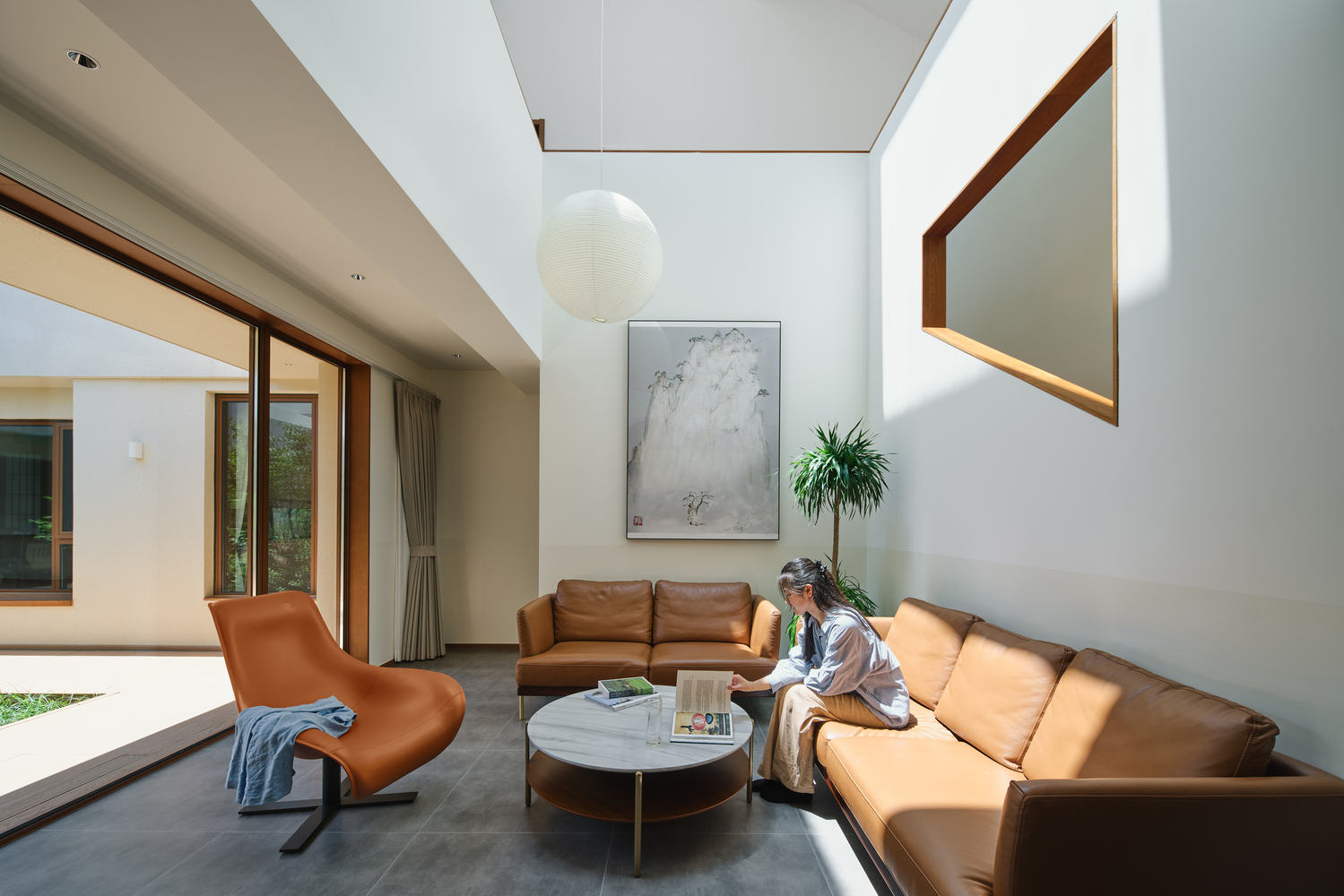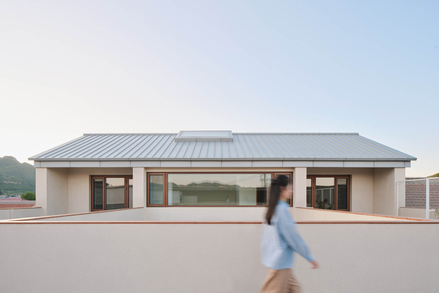 对远山景观的巧妙借景:项目对远山景观的捕捉和利用也堪称精髓。设计师将二层与屋顶平台相连,使其成为欣赏山景和日出日落的绝佳场所。通过加宽和外挑二层通往屋顶平台的过道,形成了一层客厅的挑檐,同时也为二层创造了一个可供驻足观景的空间。横向水平长窗的窗台与屋顶平台的女儿墙共同构成了完整而连续的庭院界面,这种设计使得居住者在室内即可饱览庭院、远山、以及落满鸽子的屋顶,将自然景观最大程度地引入生活。这种借景手法,不仅提升了建筑的美学价值,更增强了居住者的精神享受。
