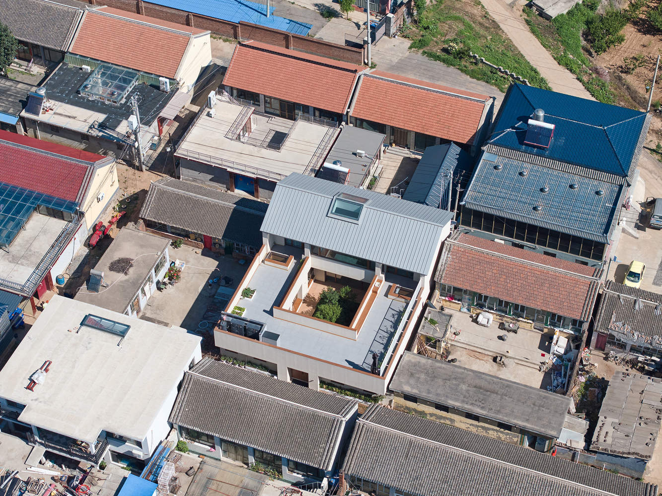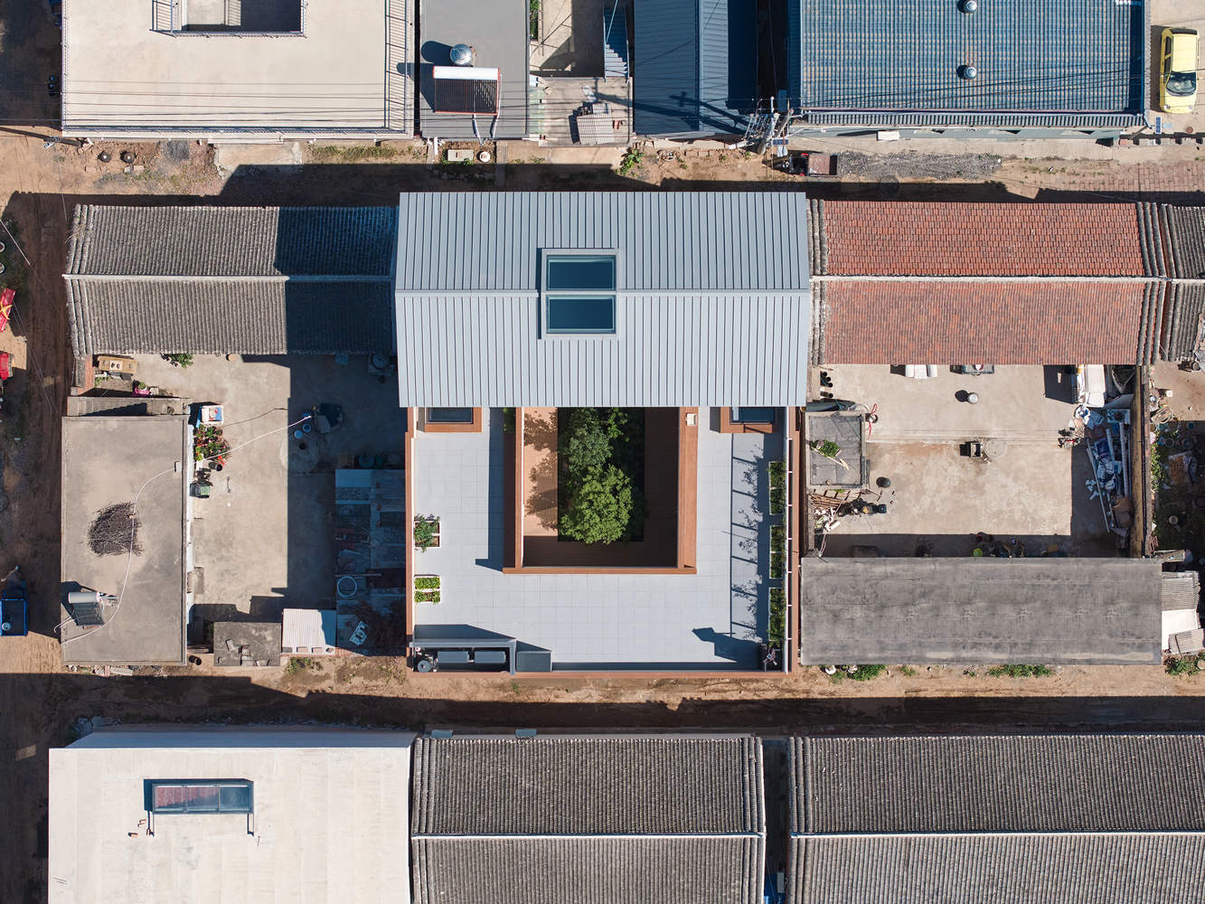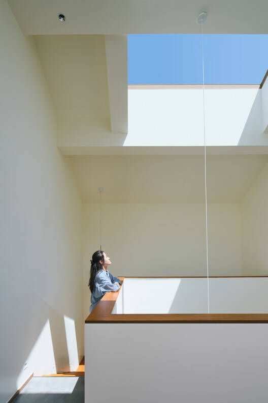 Considering the coordination with surrounding buildings, the roof of the main house is a double sloped roof with unorganized drainage. Rainwater is discharged into the courtyard through rainwater pipes wrapped in the wall on the roof platform.. The sloping roof skylight and the elevated second floor space form a spacious and bright living room. The L-shaped staircase railing leading to the second floor is made into two straight walls and a hole is opened on the wall facing the courtyard, creating a stable and comfortable sofa space, while also creating a frame view of the staircase opening. The bedrooms on the east and west sides of the first floor of the main room are connected to the wing rooms, and the living room eaves are in front of the windows, which does not provide ideal lighting. Therefore, a small window is opened on the top to introduce daylight. The reverse ridge of the skylight naturally forms a viewing seat on the roof platform.