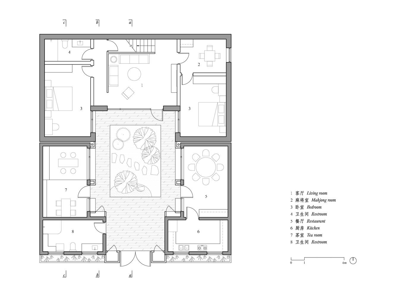 庭院是设计的核心,它串连起所有生活空间。改造前正房与厢房是割裂的,院内没有景观,室内外缺乏联系。我们将正房与东西厢房直接相连,并重新梳理了建筑界面,创造出一个稳固内向的庭院空间,每个房间都与之产生了关系。我们利用原有东西厢房的挑檐,让茶室和餐厅的墙面内凹,最大化窗景,窗台处自然形成室外座位,可随时坐下观赏庭院。一层卧室直面庭院,出于隐私考虑,窗户相对较小;一层客厅的落地窗让院子的景观直接进入室内,水平挑檐让客厅的视野向庭院延伸,同时形成室外的檐下灰空间。