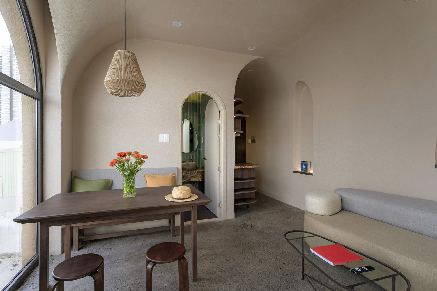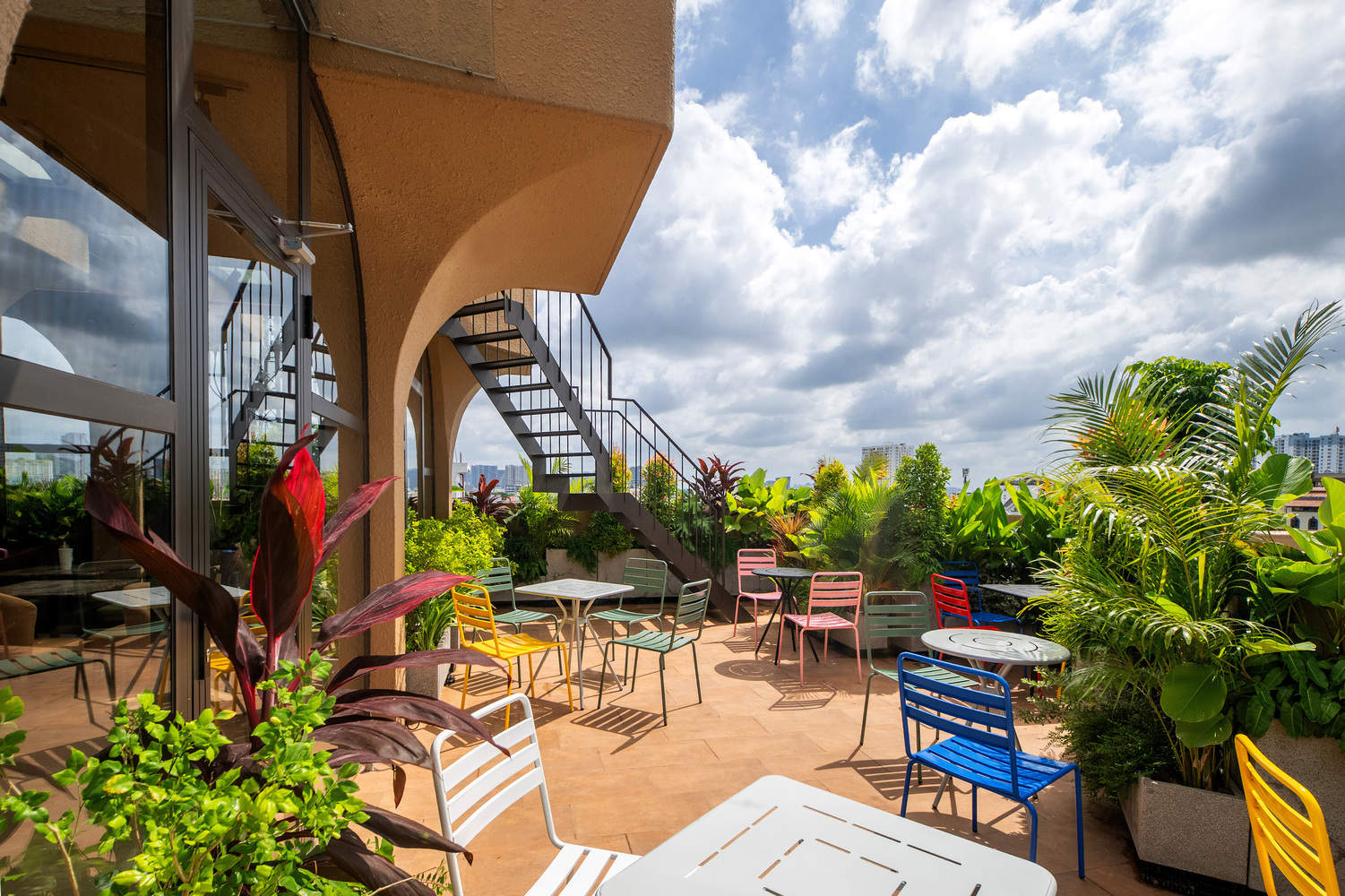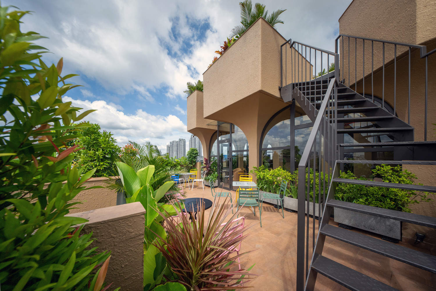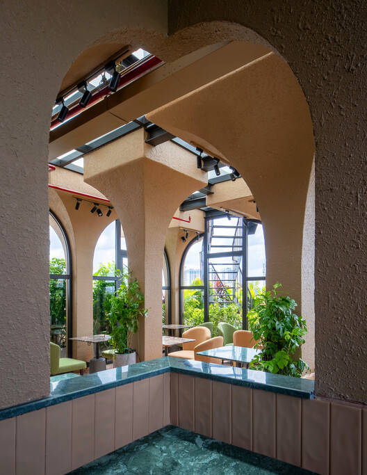 步入建筑内部,自然灵动的设计语言一以贯之。商业空间与九间温馨公寓均采用了柔和的曲线、不规则的造型以及温暖的陶土饰面,营造出亲密而流畅的空间氛围。每间公寓都设有一至两个绿植葱茏的阳台,模糊了室内与自然的界限。建筑顶部,屋顶咖啡馆与共享办公空间坐落于纤细如树干的立柱支撑起的遮棚之下,上方是散发柔和光芒的半透明屋顶。一条之字形楼梯通向屋顶花园——这一难得的城市避风港可俯瞰城市全景。这些空间共同营造出一种探索的乐趣,让人仿佛穿梭于隐秘的城市丛林树冠之下,又似拾级而上,融入这片绿意之中。