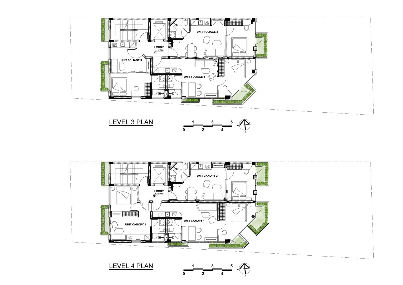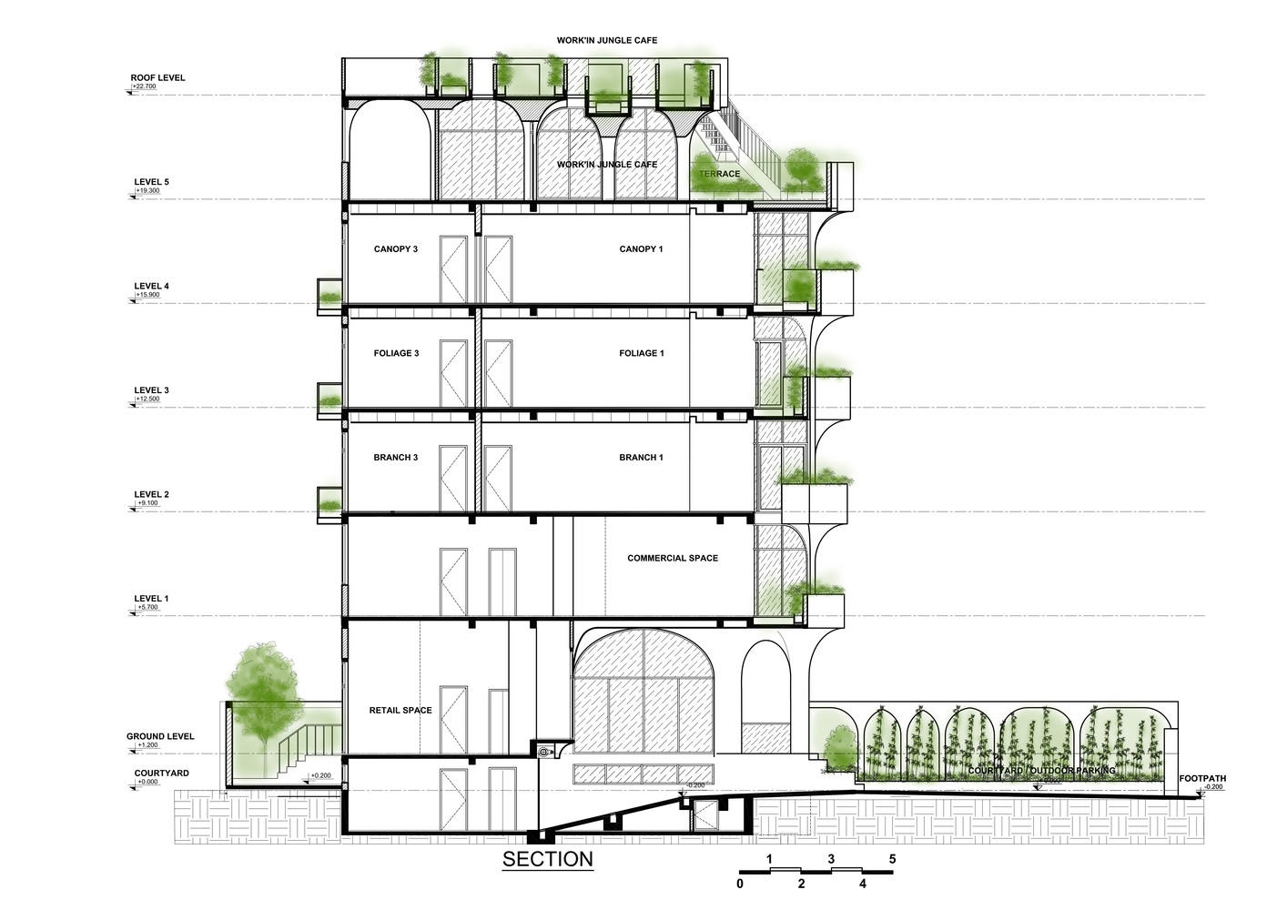 设计亮点与空间组织:该项目最显著的亮点在于其将“热带雨林”意象融入城市建筑。建筑立面通过错落有致的阳台设计,营造出瀑布般的视觉效果,模拟自然界的无序之美。内部空间设计亦延续了这一主题,柔和的曲线、不规则的造型、以及温暖的陶土饰面,共同营造出亲密而流动感十足的氛围。功能组织方面,项目巧妙地融合了地下室、商业空间、灵活布局的公寓以及屋顶咖啡馆和共享办公区,实现了空间利用的最大化。垂直交通核心筒的设计和服务区域的精心规划,也为商业空间的拓展和公寓的未来改造提供了便利。