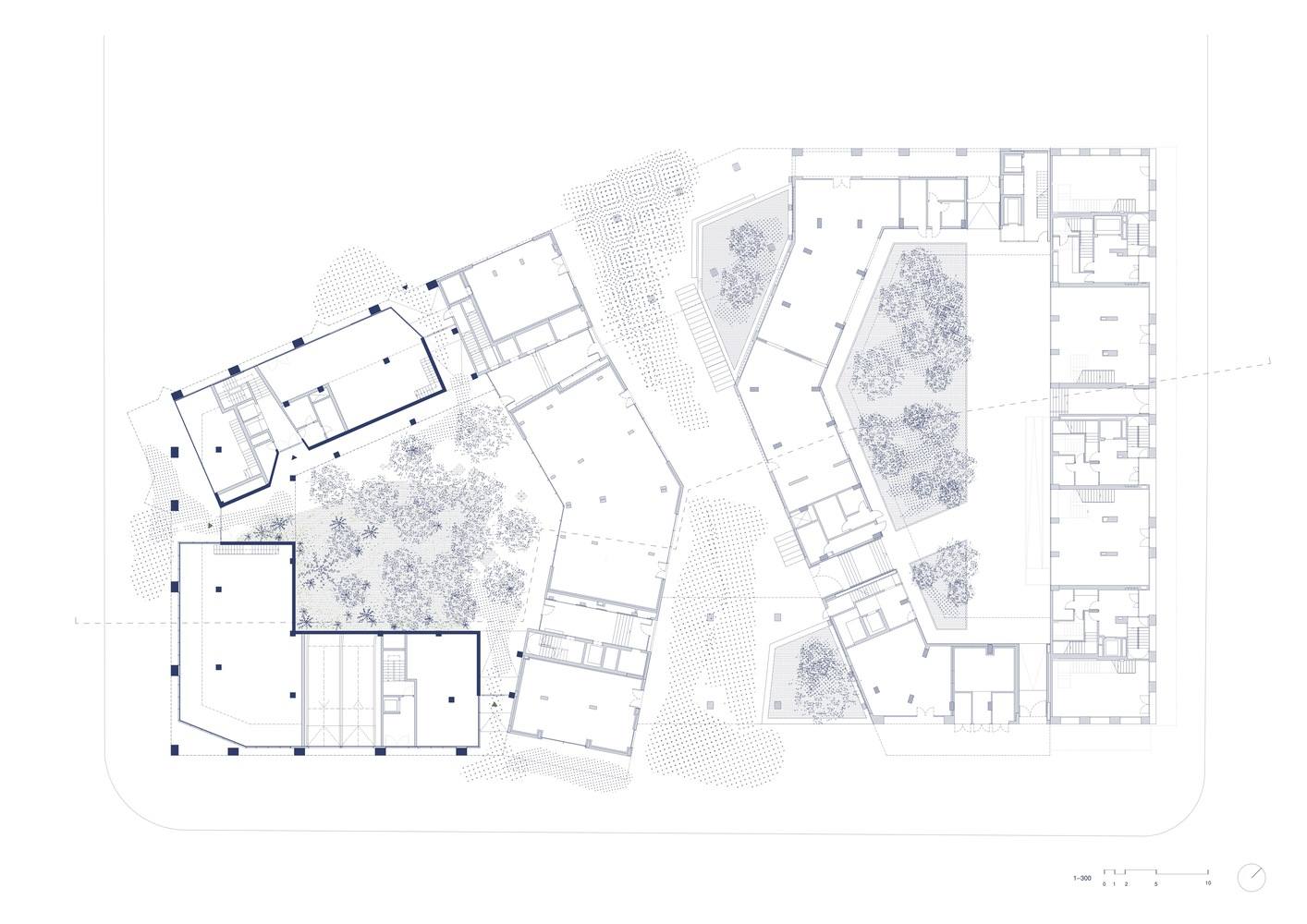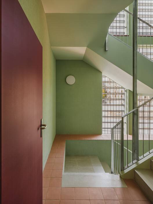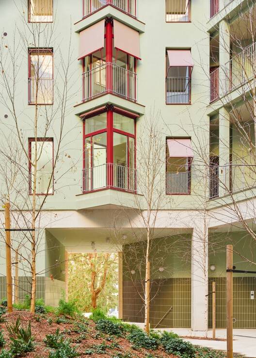 该建筑群因巧妙融入被一条步道贯穿的紧凑城市街区而引人注目。每两栋建筑围绕一个庭院布局,这种设计有助于促进邻里关系,营造社区氛围。