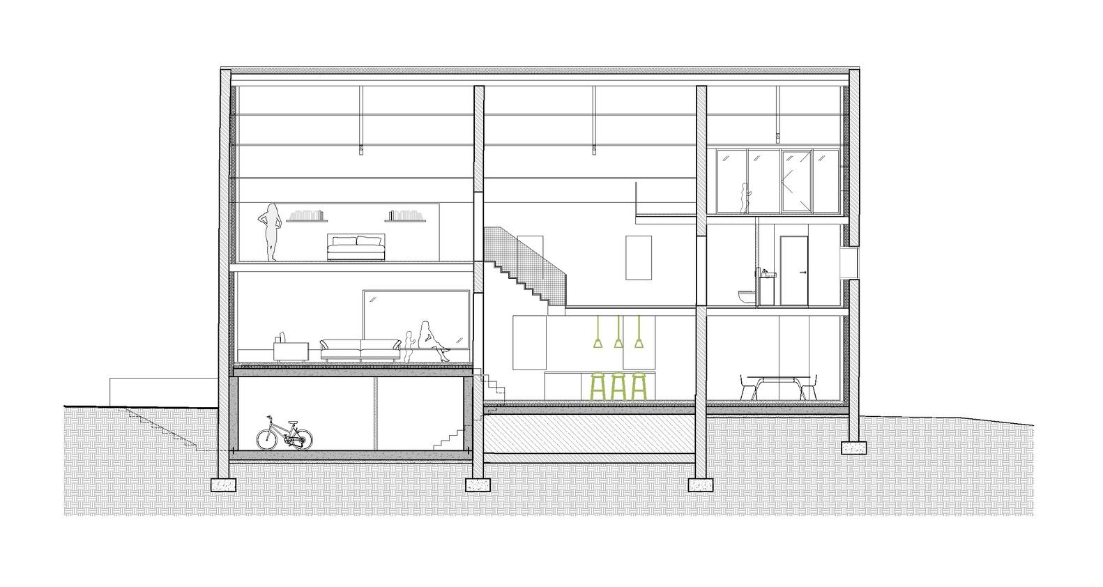 空间改造的巧妙策略:这个项目最引人注目的亮点在于其对原有谷仓的改造策略。建筑师没有完全推翻原有结构,而是选择保留外立面的历史感,通过在建筑体量中切割出一个三角形内庭院,巧妙地引入自然光线,极大地改善了内部的采光和通风。这种策略不仅保留了建筑的历史记忆,还通过空间上的重新组织,创造了内外空间的流畅过渡。这种设计手法体现了建筑师对历史文脉的尊重,以及对现代生活方式的深刻理解,成功地将旧建筑赋予了新的生命力,使其既保留了历史的厚重感,又满足了现代生活的舒适需求。