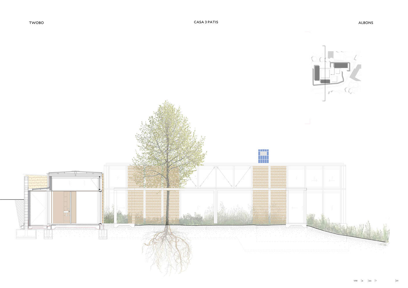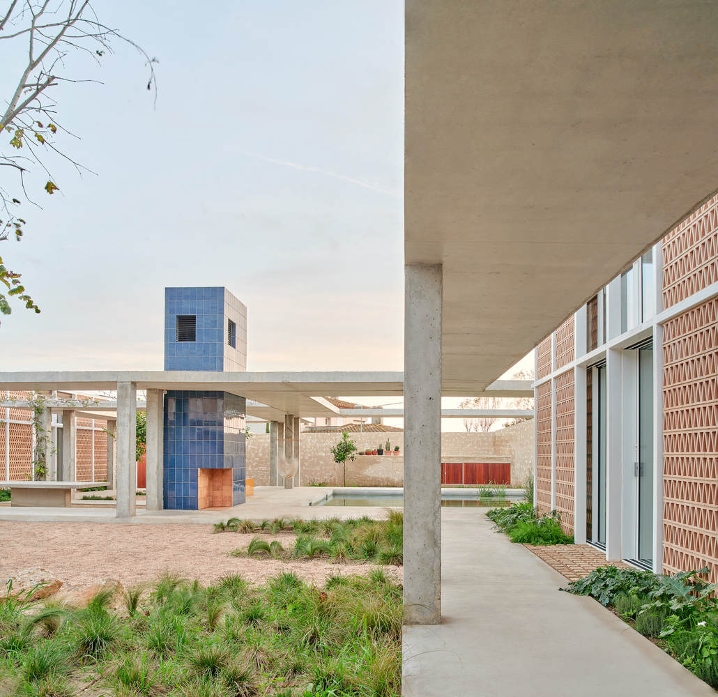 因此,Twobo 将 Casa Tres Patis 设想为围绕三个天井布置的一组独立的亭子,成为家庭生活的支柱。每个庭院都是一个生活空间,一个聚会和沉思的地方,是建筑的活跃元素。第一个是开放的,被一棵树遮蔽,让人想起一个大广场上的社交生活,有一张石桌、一个烧烤架、一个爬坡的葫芦和一个玩佩坦卡的区域。后者将罗马的 Impluvium 重新解释为一个沉思和休息的地方。第三个是私密而宁静的,有一个芳香的花园,让人想起修道院的花园。