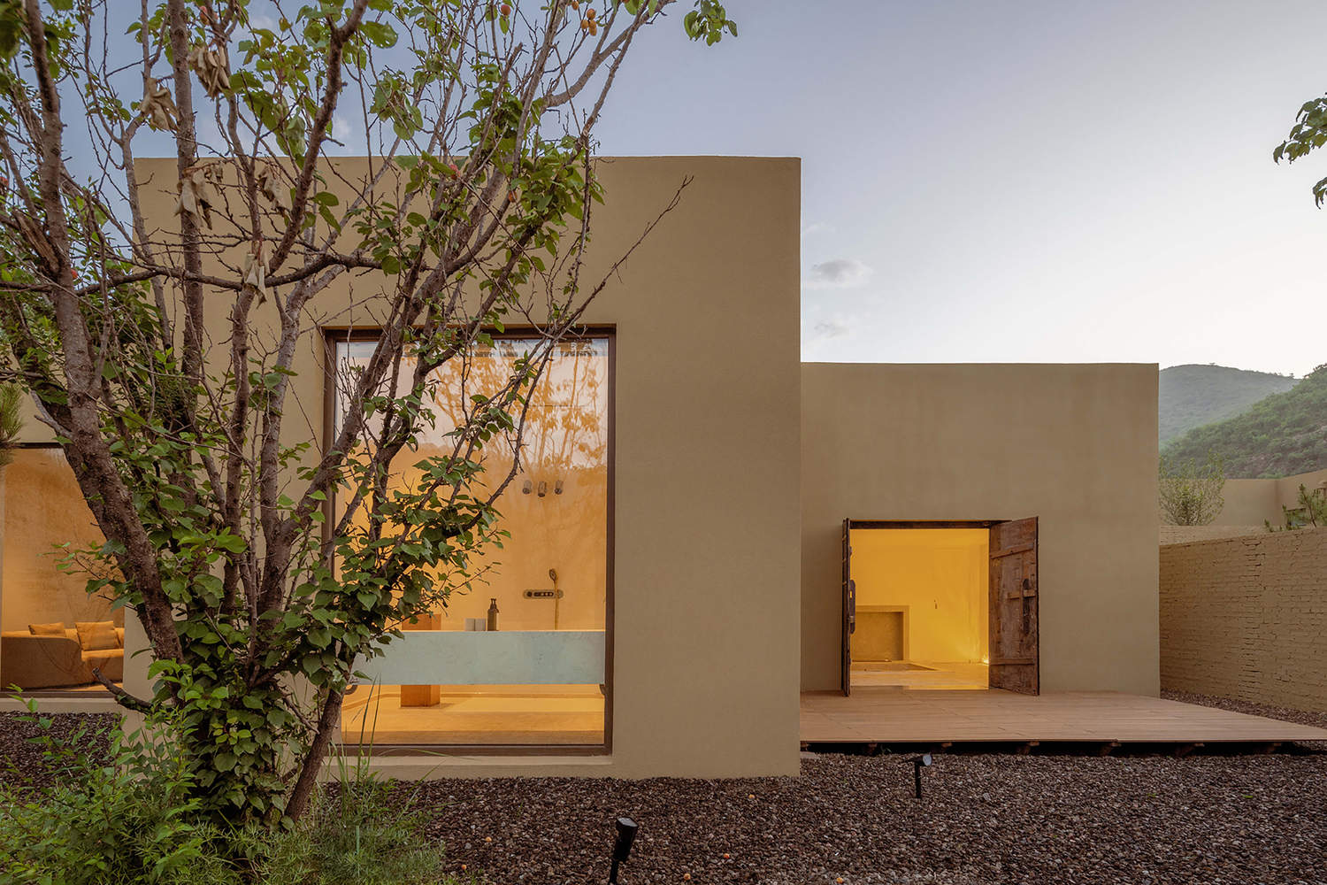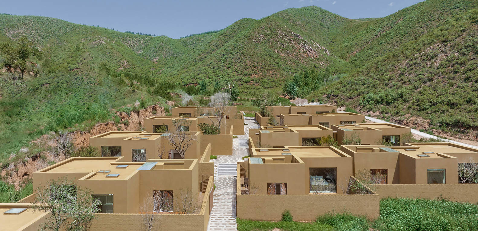院墙与客房外墙皆选用了和场地土质颜色接近的涂料,远看像是从大地里自然生长出来的几何雕塑。与此同时,围墙之内、院落之间也有着丰富的空间体验,昔日的村间小路变成了酒店内部的公共街道,纯净的墙面与开阔的空间尺度,能够满足展览、讲座甚至小型演出等公共活动,未来这里将成为酒店最具活力之地。