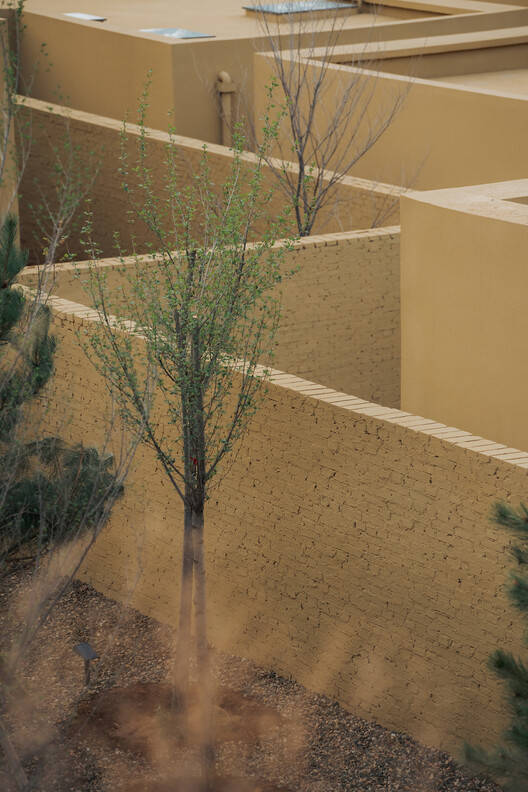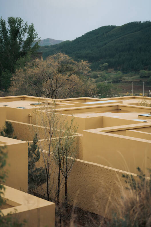 The exterior walls of the courtyard and guest rooms are coated with materials that are similar in color to the soil of the venue, giving the impression of geometric sculptures naturally growing from the earth from a distance. At the same time, there are also rich spatial experiences within the walls and between the courtyards. The village paths of the past have become public streets within the hotel. The pure walls and open spatial scale can meet the needs of public events such as exhibitions, lectures, and even small performances. In the future, this will become the most vibrant place in the hotel.