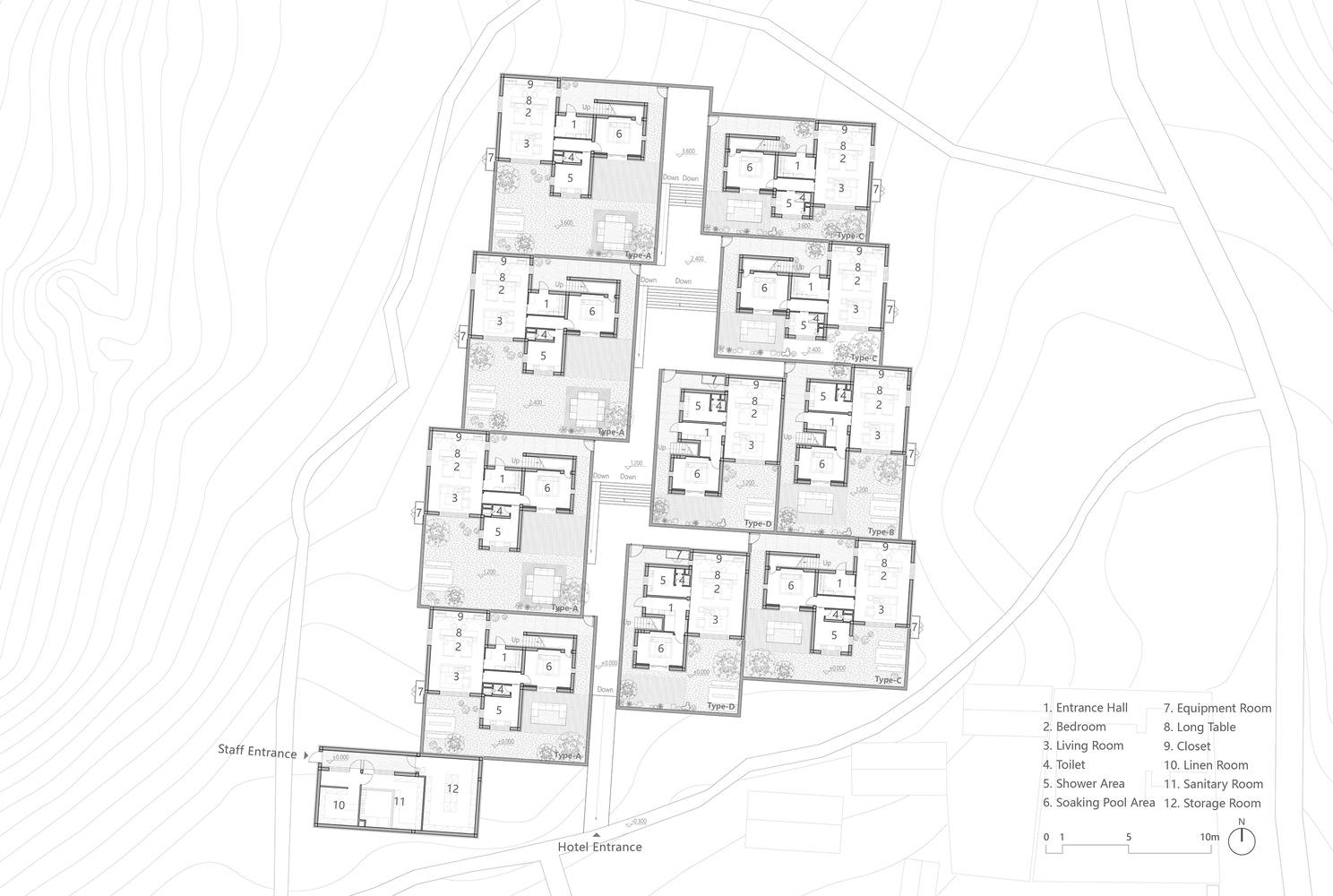 建筑整体没有明确的中心轴线,不规则的平面布局延续了村落自发生长的形态特征。承袭山村原生风貌,10 间客房单元随场地高差产生了 4 个不同的标高。