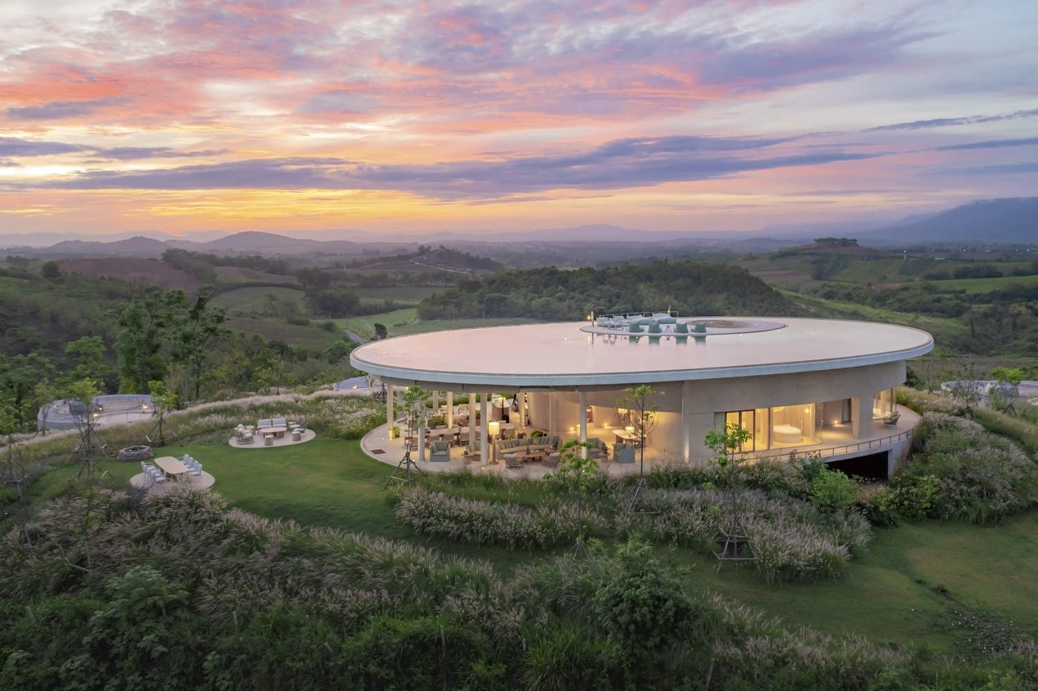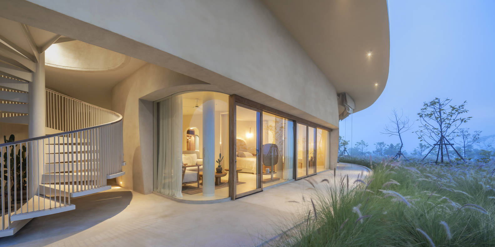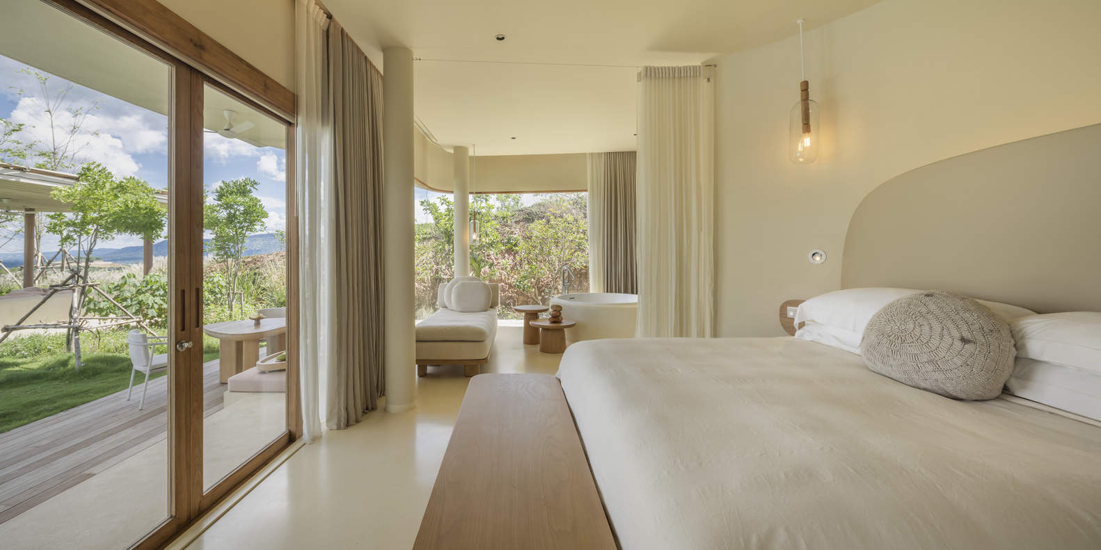 空间设计与细节处理: 项目在空间设计上注重曲线和圆形元素的运用,与周围山景相呼应,营造出柔和而流畅的视觉感受。室内设计采用单一米白色调,模糊了墙壁、地板和天花板之间的界限,消除了空间边缘的锐利感,使整体空间更显开阔和舒适。细节处理方面,橡木家具的曲线设计、独立浴室的圆角处理以及大地色系与粉色点缀的搭配,都体现了设计团队对细节的极致追求和对自然元素的尊重。这种对细节的精心打磨,使得整个别墅在视觉上达到了一种和谐统一的效果,营造出一种宁静而舒适的居住氛围。