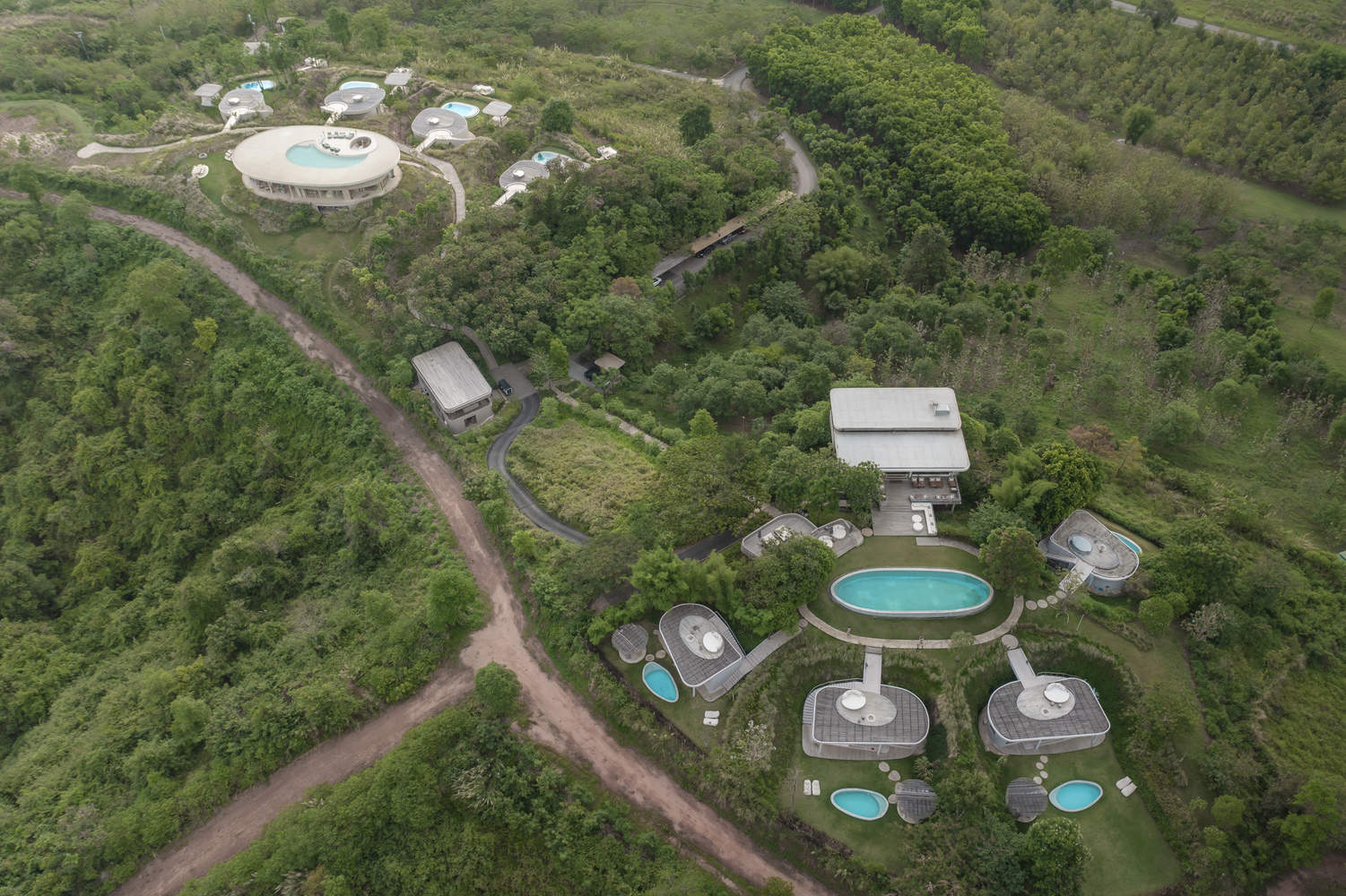 The villa is hidden behind the mountain leading to the main passage of the project, consisting of a pavilion, a lounge area in front of the building, a rooftop lounge and barbecue area, a private swimming pool, and an outdoor bathtub platform by the mountain. These spaces increase the possibility for guests to interact with nature, observe stars, take outdoor showers, and barbecue with fire. The three bedroom swimming pool villa is built at the highest point of the site. Each bedroom with a bathroom has a unique layout, facing three different directions of scenery. This option allows guests to stay for a few more nights and enjoy different views when they wake up in the morning. The villa features a 200 square meter open living room, a 14 seater dining table, a workspace, and a food storage room.