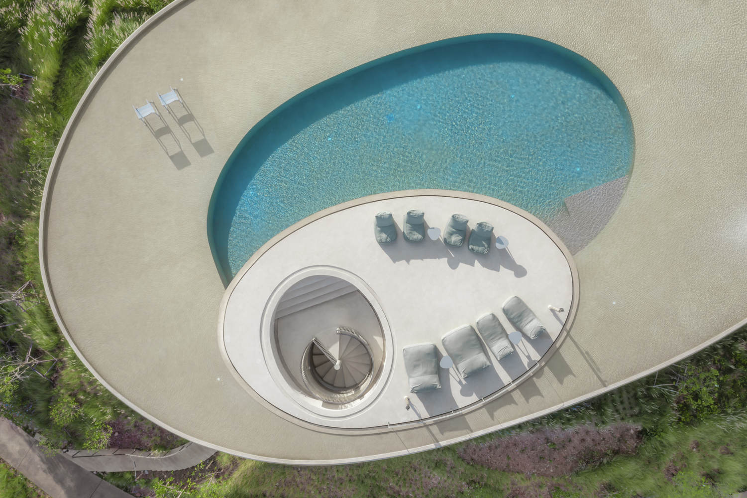 空间已准备好用于派对。设计团队在客厅为宾客设计了松散的家具组合,可供宾客整日休息。宾客可以更换沙发位置,欣赏不同的风景。别墅的螺旋楼梯通往私人屋顶,宾客可在此欣赏绝佳的 360 度全景。设计团队精心设计了游泳池,以反映天空的景色。在浅水区,宾客可以在云彩的倒影上行走。在深水区,宾客可以与地平线共游。