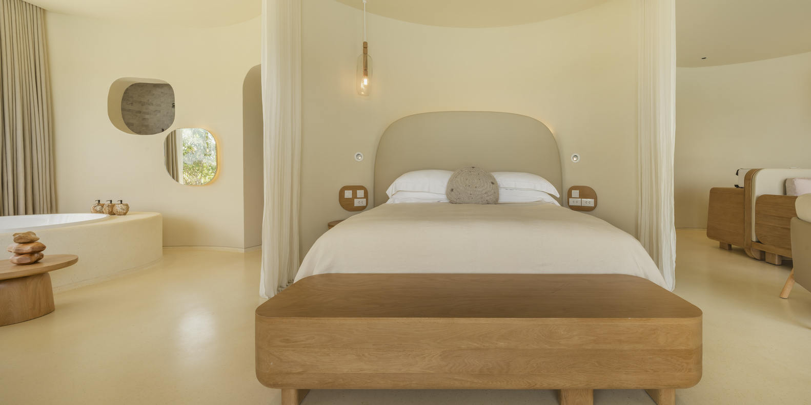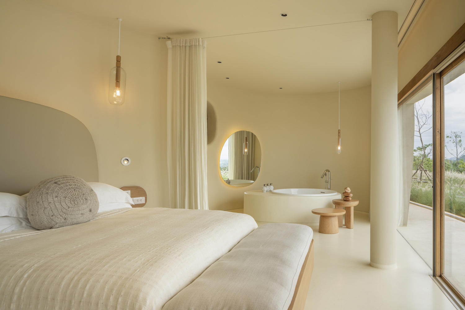 The interior design of suites and villas adopts circular and curved shapes, echoing the mountainous scenery and creating soft shadows cast by natural light. The designer uses a single beige color to blur the boundaries between walls, floors, and ceilings. Eliminate the seams in the corners of the room by bending the ends of the walls at the floor and ceiling. There are no sharp shadows at the edge of the space. The layout extends the indoor space towards the east. Each bed is placed in the best position to enjoy the scenery. Another important layout is the location of the independent bathtub, where guests can enjoy the scenery and its reflection through a mirror.