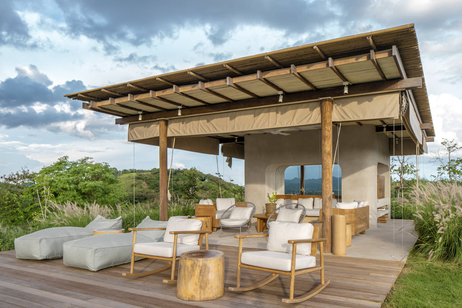 考艾萨拉别墅一期别墅面向日落,而二期几乎所有别墅都面向日出。唯一的例外是位于山顶的三卧室泳池别墅,该别墅享有 360 度全景视野。设计灵感源自周围山峦的轮廓、景观的线条以及场地的有机特性。建筑应尽可能将自然元素融入室内空间。迎接宾客的第一座建筑是一座开放式凉亭,采用深棕等大地色调。凉亭的天花板由竹子制成。