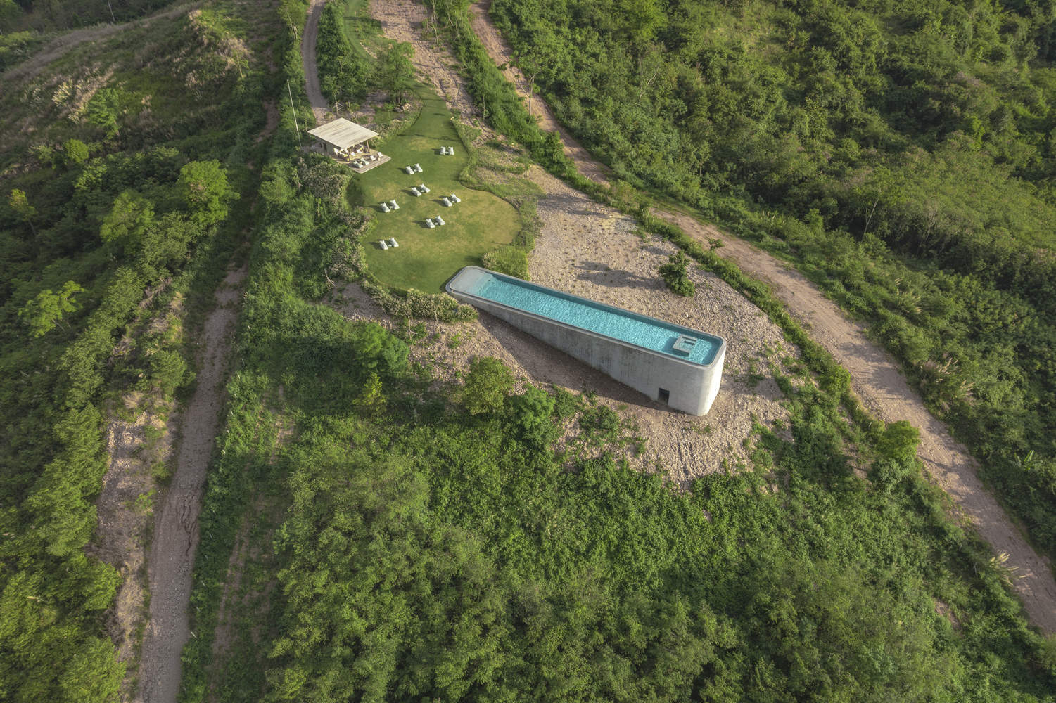 所有宾客共用的主游泳池距离别墅 250 米。设计团队在日落方向设置了长达 32 米的游泳池,游泳池朝向天空。80 平方米的泳池酒吧是一座开放式凉亭,包含一个休闲区和卫生间。设计团队在酒吧内放置了一面大镜子,将主游泳池的景色反射到泳池酒吧内部。宾客每天游泳时,可以透过重重山峦,体验太阳逐渐消失的过程。