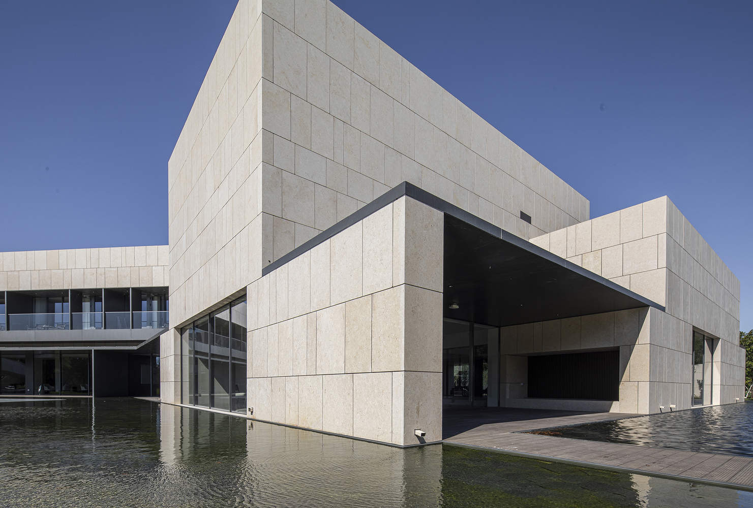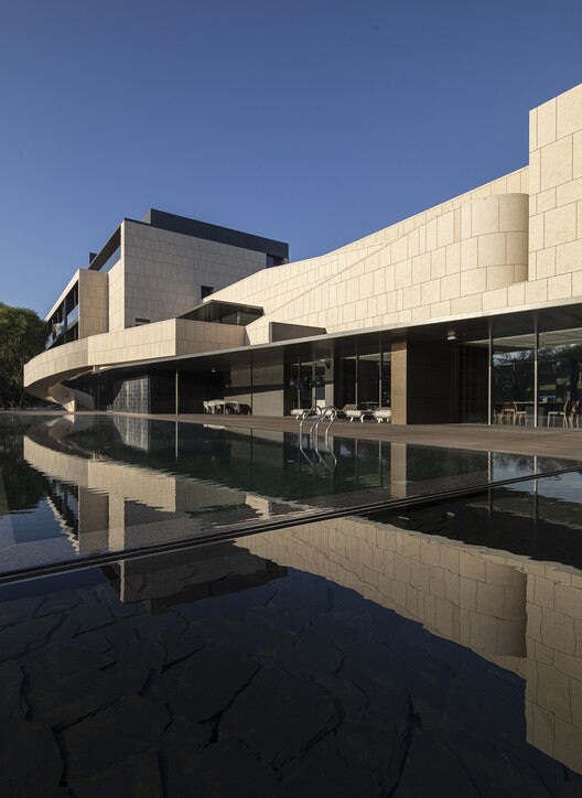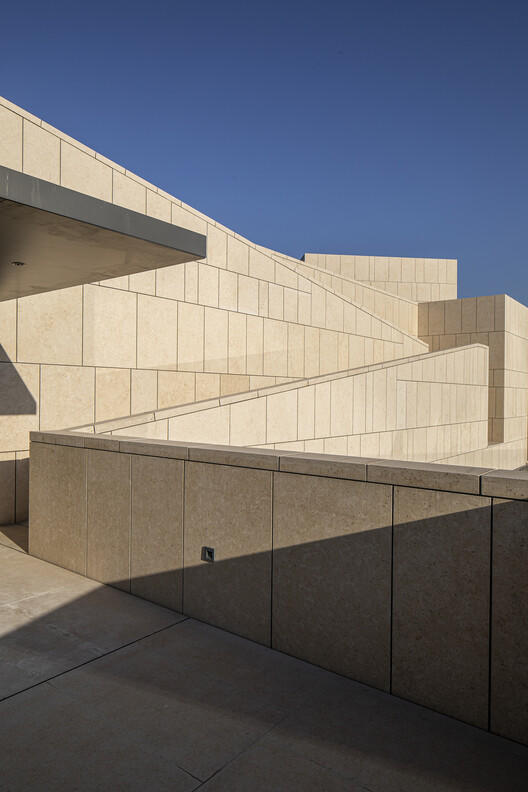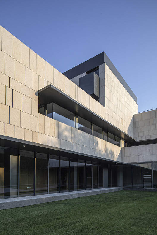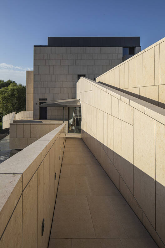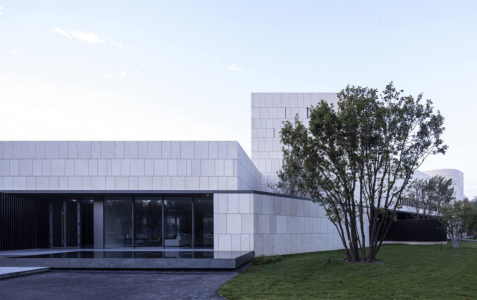 建筑外墙被设计成米黄色石材,作为北方,米黄色的石头更容易让人在寒冷的冬季联想到一丝暖意,这样的选择同时也是业主的美好期待,这也正反映了北方人和这片土地的共同性格,坚实的外墙,厚重的体量。