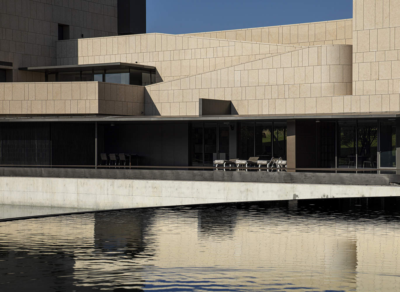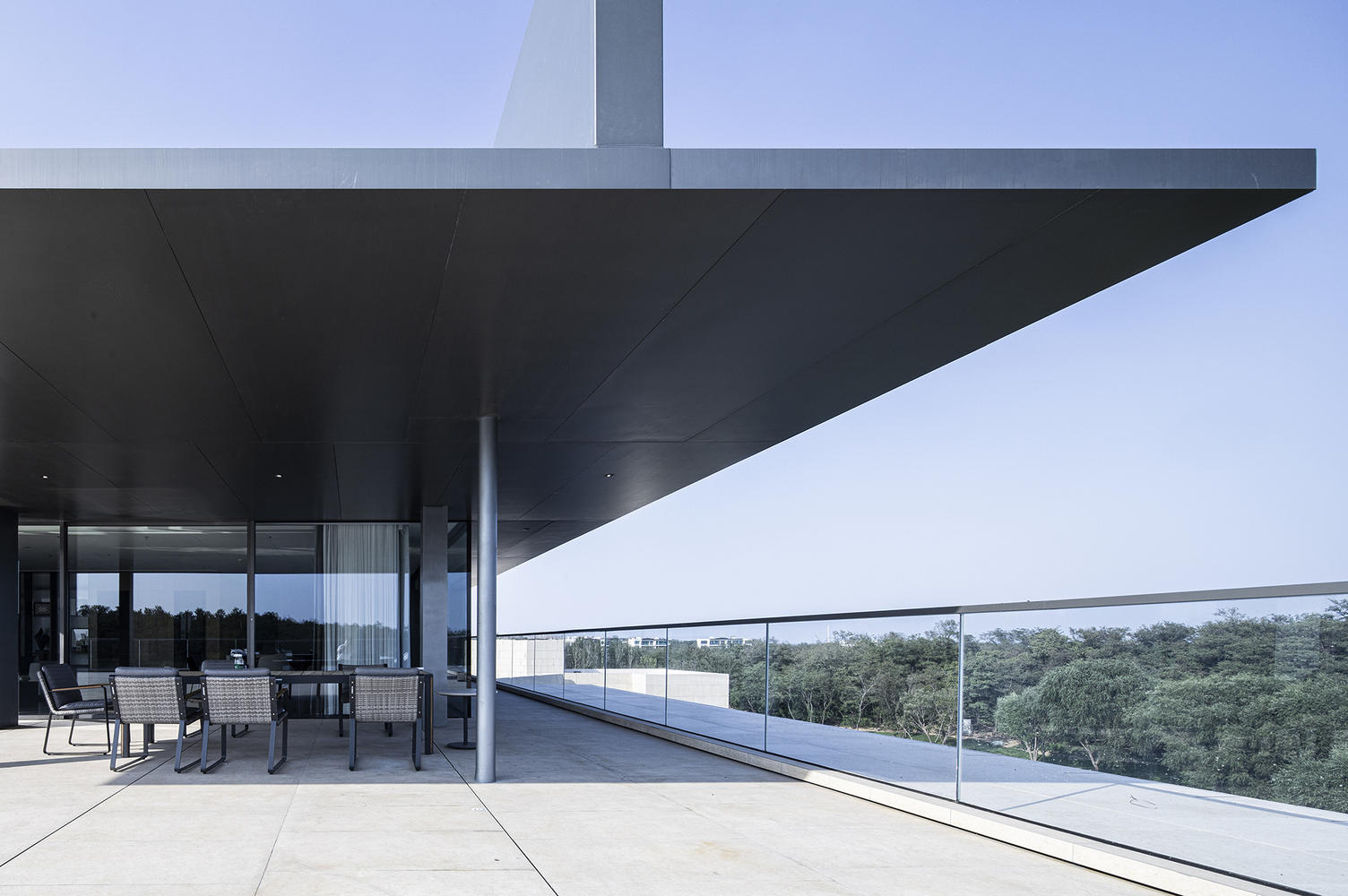 The stone exterior wall above this abstract horizontal line creates a sturdy and heavy volume, highlighting the emptiness and transparency of the lower part. Looking through the long eaves, the loose nature in the distance has established a certain order, abstracted it, and formed a concentrated landscape belt, collecting the surrounding wild landscapes into one combination.