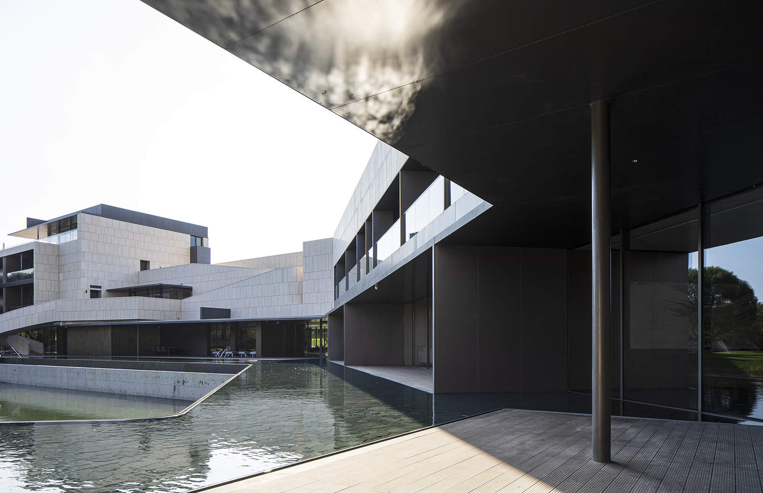 原有建筑沿着刺槐密林边缘线性分布,主体被拉长至百米,且建筑的南侧和东侧均伴有优质水景。但原有建筑的室内布局为单侧走廊,存在大量冗长的过道空间。立面处理也十分封闭局促,建筑周边低缓延绵的微坡景观被托斯卡纳风情的细碎竖条开窗切分得支离破碎。得天独厚的原生景观被毫不吝惜地拒之门外。