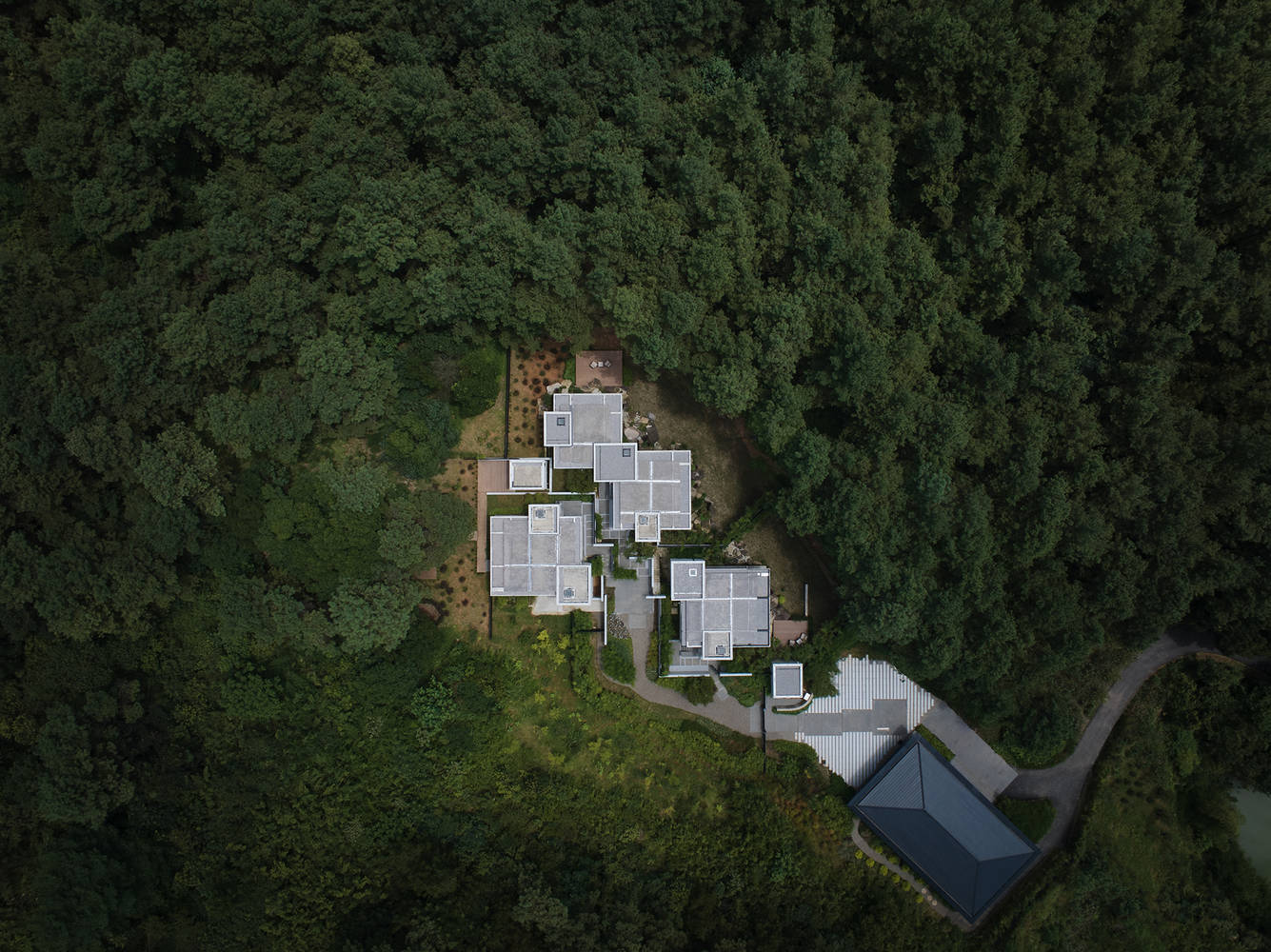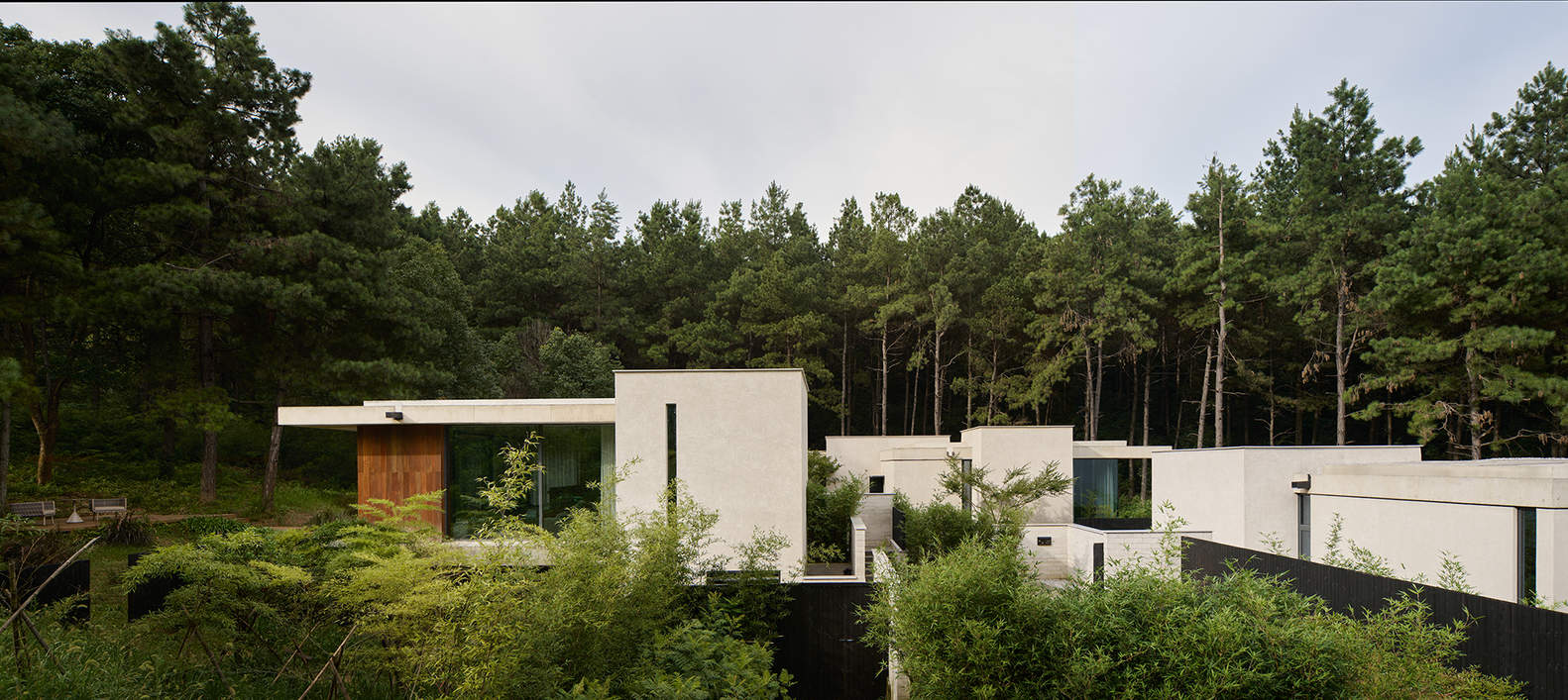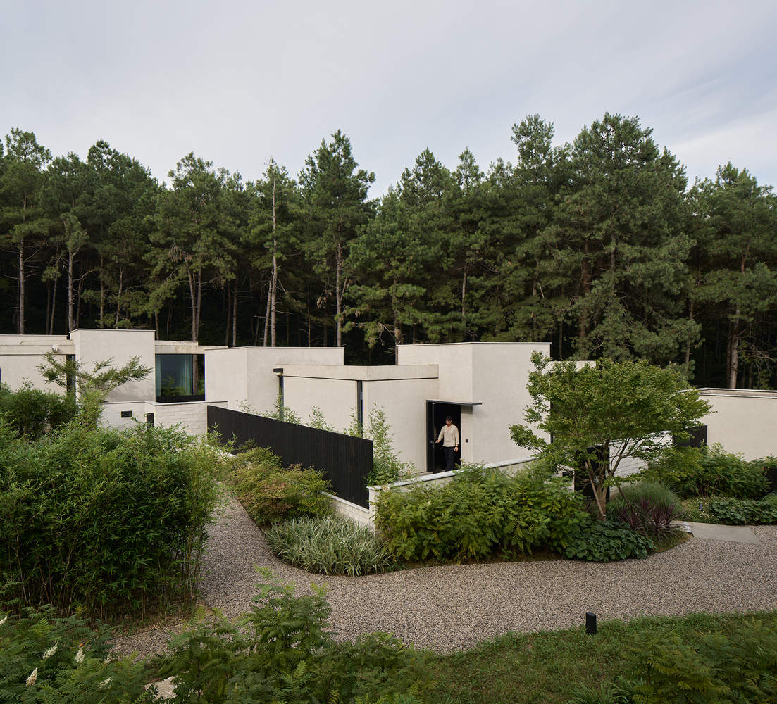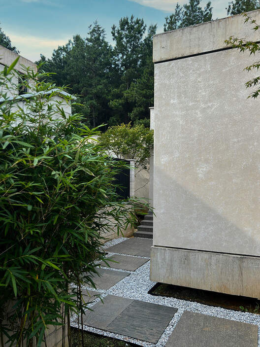Passing through the wine room, a curved bamboo woven wall leads people into the guest room area. The landing has also changed from a hard ground to a soft sand and gravel ground, and the vacation atmosphere is constantly enhanced and changed by the irregular sand and gravel paths on the edge. A small square has been designed at the end of the road as a stopping space before entering the house, further creating a sense of secrecy. Three minimalist and independent individual buildings are quietly located deep in the valley, surrounding the square. Looking up, you can see the tall natural pine forest behind the buildings, but you cannot touch it yet. Faced with the "obstruction" of scattered walls, leave enough imagination for the space behind.