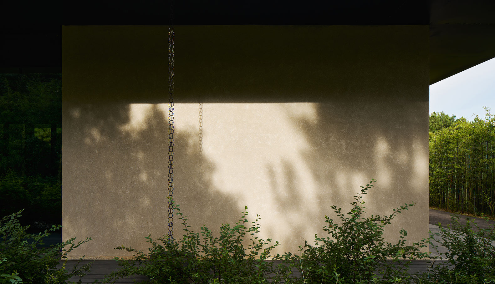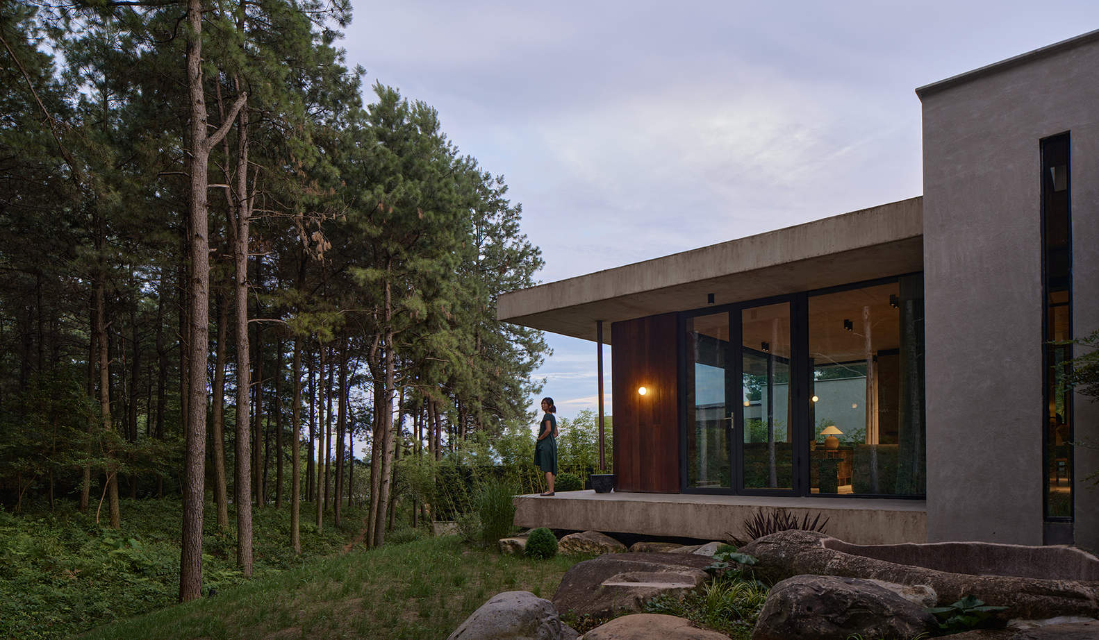 穿过红酒室,一面竹编纹理的弧形围墙将人们引人客房区。落脚也从硬质的地面变成细软的沙石地,度假氛围在边缘不规则的沙石行径中不断烘托变化,路尽头设计了一方小小的广场作为入户前的驻足停留空间,进一步营造出隐秘感。三栋极简独立的建筑单体悄然坐落于山谷深处,环绕在广场周围,抬头可以望到建筑后面高大的自然松林,但还无法触碰。面对错落墙体的“阻挡”,为后面的空间留足想象。