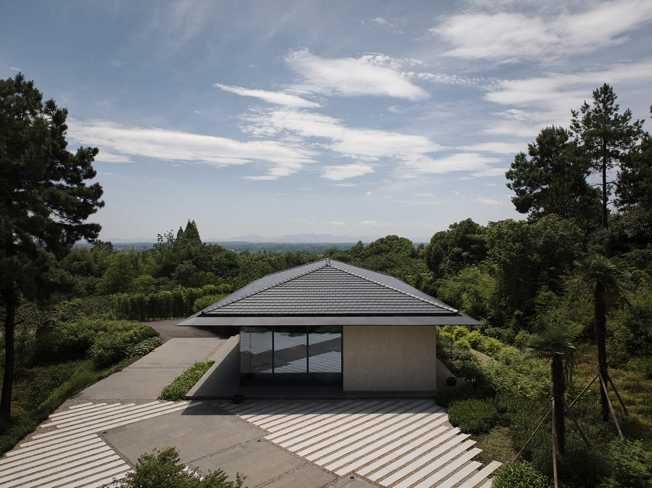 After passing through the functional space enclosed by the entrance, the body gradually dissolves and the space is fully opened. The light colored wood grain ceiling conforms to the roof shape, with a gentler slope. It extends to the edge and is connected to the black eaves with a black flat roof along the window. It further extends from indoors to outdoors, cantilevered to form an open gray space, and connects with the small square facing the pine forest in front of the building. In seasons with suitable temperatures, glass doors can be opened to incorporate the small square into the building space. In addition to functional blocks, all facades are made of floor to ceiling glass to maximize the landscape.