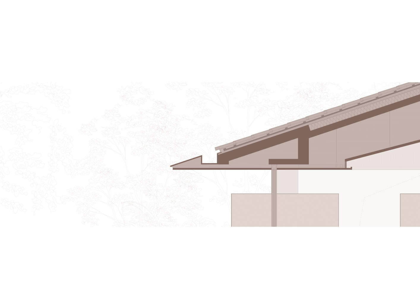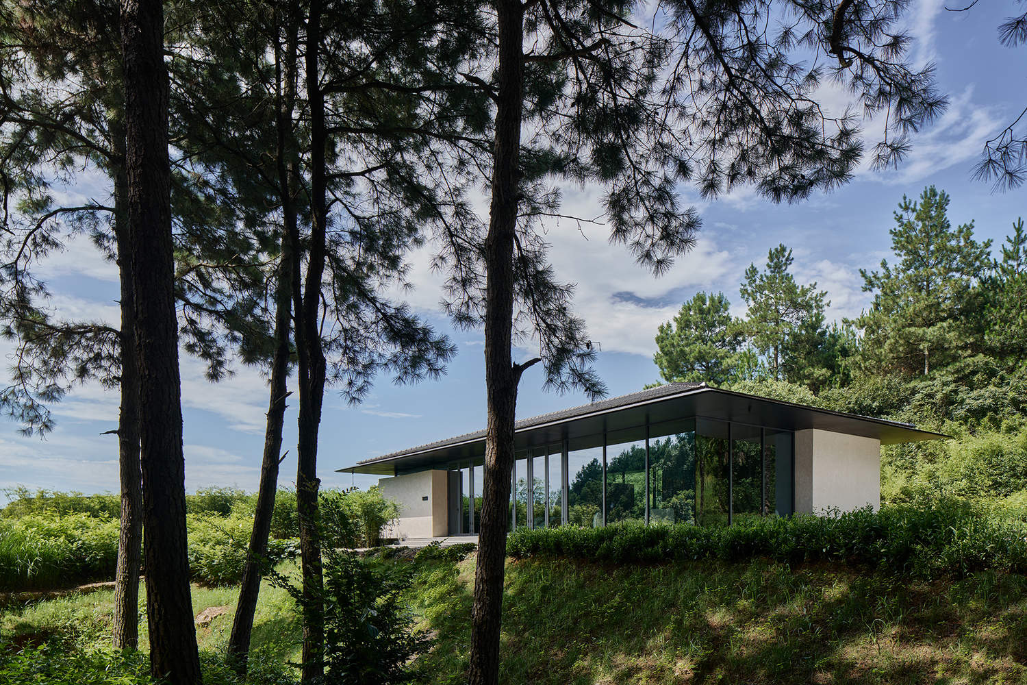 穿过入口相对围合的功能性空间之后,体块逐步消解,空间全部打开。浅色木纹吊顶顺应屋顶造型,坡度更缓和,延伸至边缘处后沿窗用黑色平顶与黑色屋檐相连,进一步从室内延伸至室外,悬挑形成开阔的灰空间,并与建筑前面向松林的小广场对话贯通。在气温适宜的季节,可以敞开玻璃门,将小广场纳为建筑空间的一部分。除了功能性的体块,立面全部采用落地玻璃,将景观最大化。