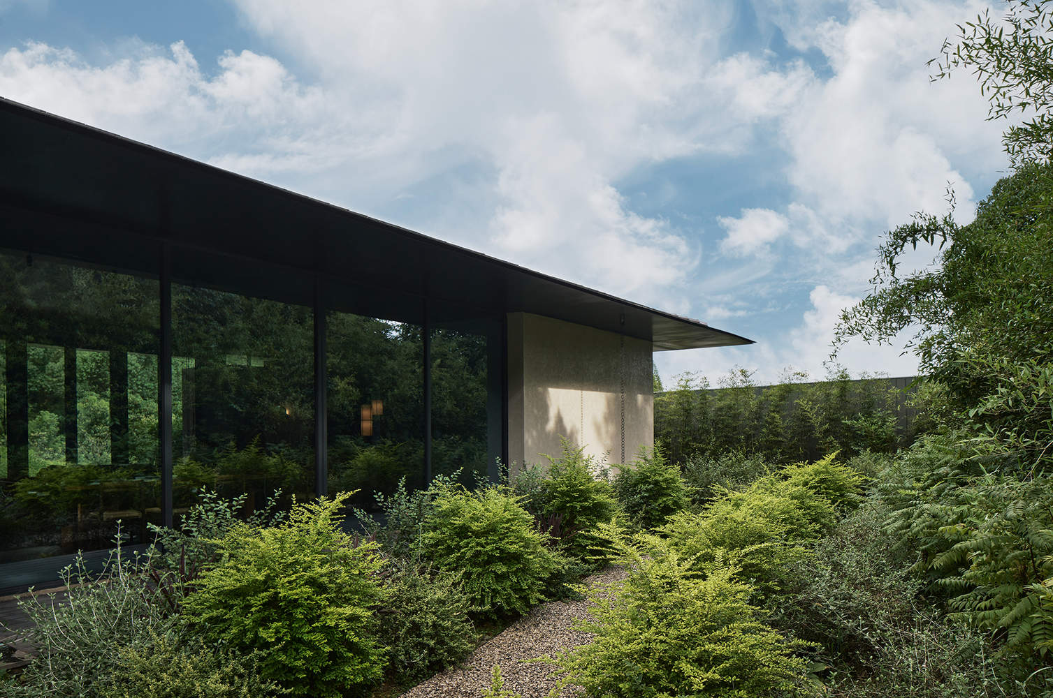 旅程起点从庄园入口处已悄然开始酝酿静谧的氛围,竹肌理的混凝土和黑色炭化木“L”形大门,低调地融入景观,像是敞开的双臂,一边拥入一片山谷绿植,一边怀抱迎接来客。