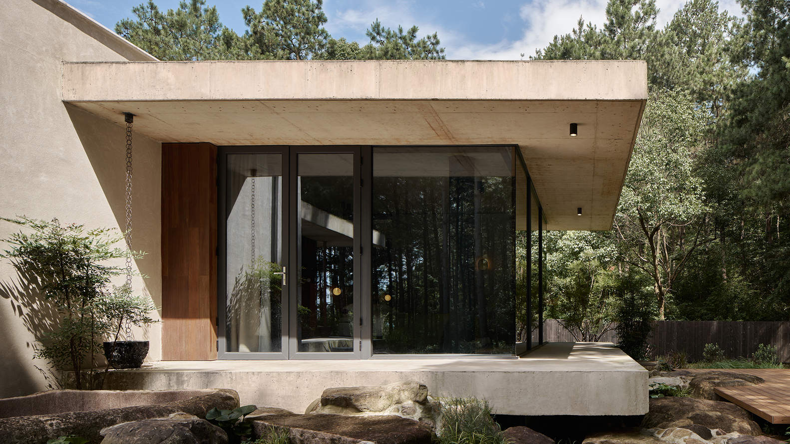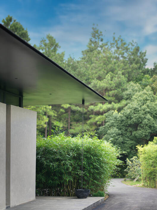 In order to eliminate hidden structures and maximize space, the building structure adopts integrated pouring of plain concrete, and also uses upturned beams and pre embedded pipelines. There are no suspended beams, ceiling shapes or light lines indoors, and the entire plain concrete roof ensures the integrity of the space. The bottom plate, which corresponds to the top plate, maintains a certain distance from the ground, naturally detached from the valley terrain, as if floating on top of the valley, respecting the natural terrain to the greatest extent possible while being associated with it. There are no extra columns between the two concrete floor slabs, only a pine area is visible, creating a borderless valley retreat experience. Partially wrapped in wood, it carries the functions of some structures and pipelines, while also adding warm and flexible elements to the tough and elegant space.