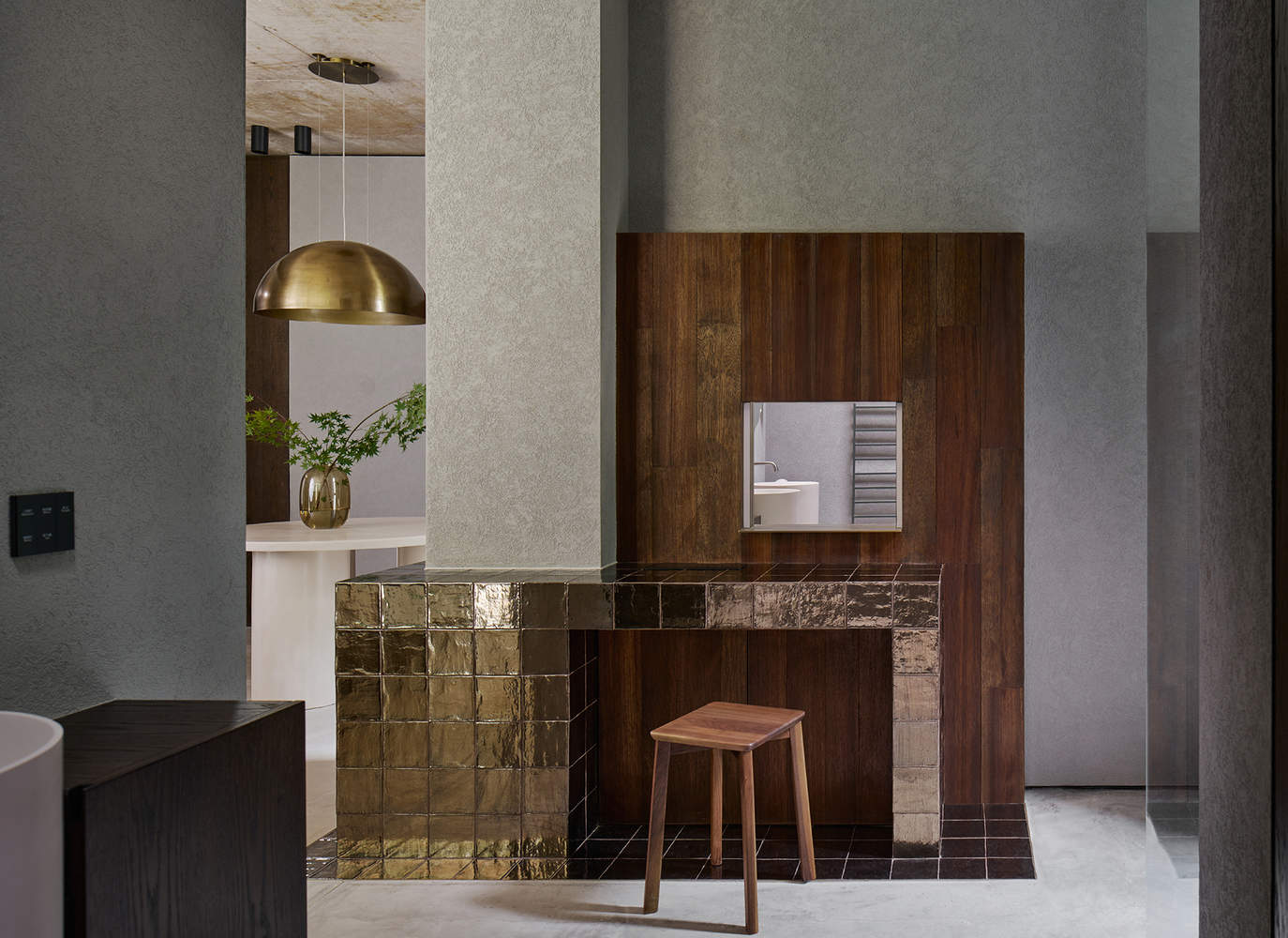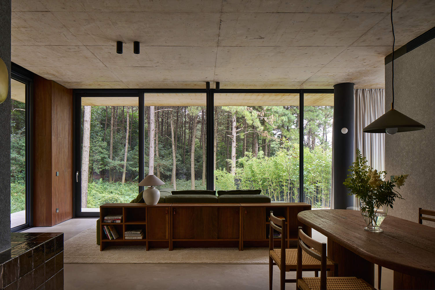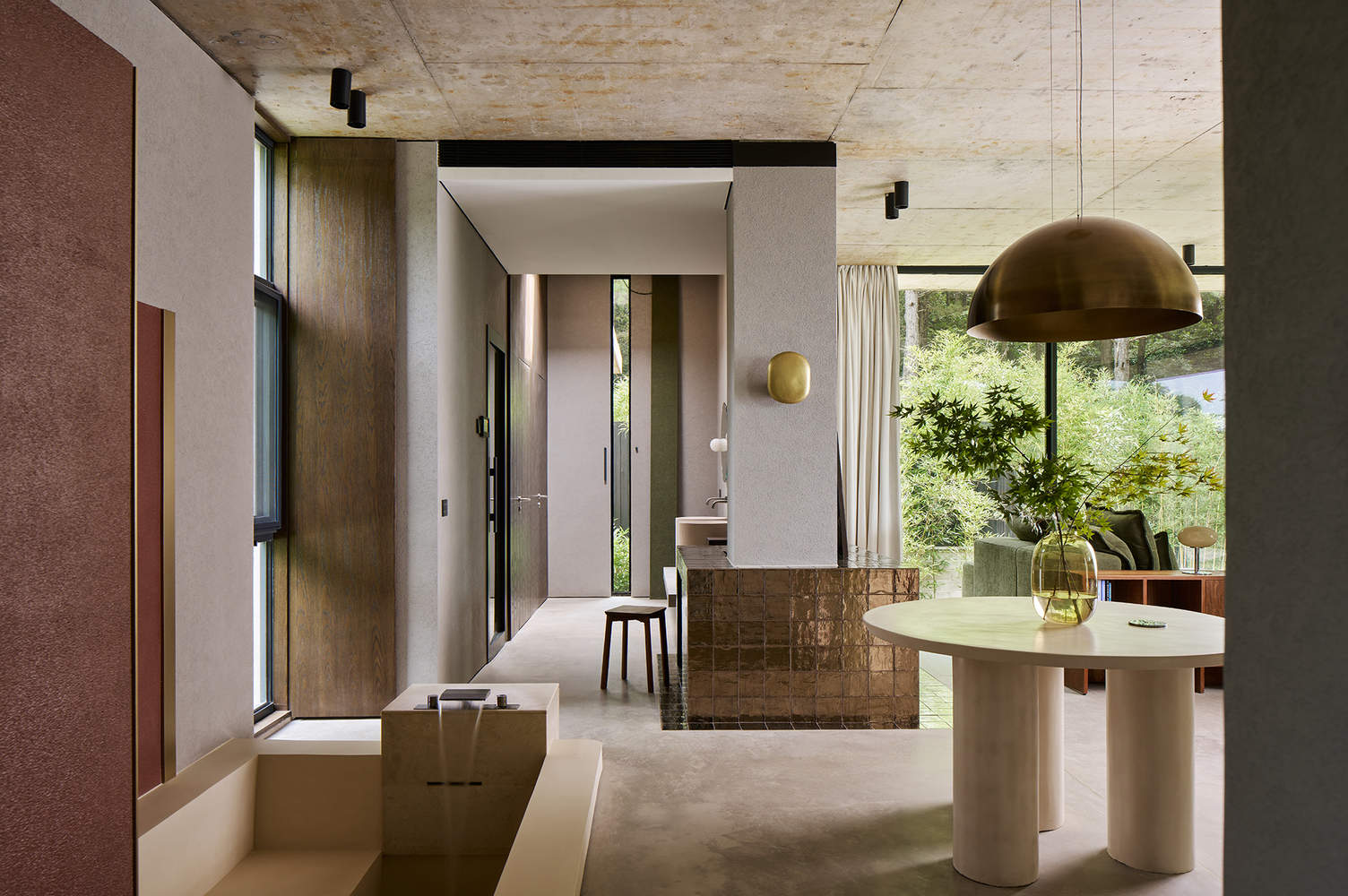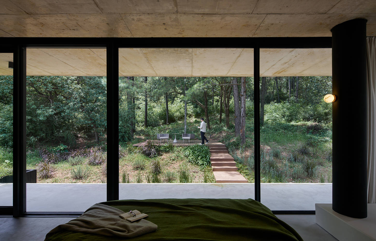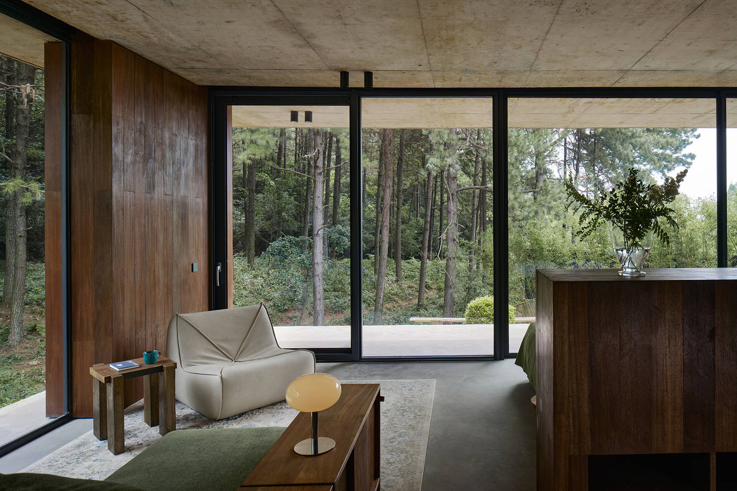 为了消隐结构,让空间最大化,建筑结构采用素混凝土一体浇筑,同时采用上翻梁并预埋管线,室内无悬梁、吊顶造型或灯线,整块的素混凝土顶板保证了空间的整体性。与顶板相呼应的底板与地面保持一定距离,自然脱开山谷地形,仿佛漂浮在谷地之上,最大程度地尊重自然地形,又与之关联。两块混凝土楼板之间无多余立柱,只有一片松境印入眼帘,打造无边界的山谷隐居体验。局部用木头包裹,承载着部分结构和管道作用,同时也为硬朗素雅的空间增添温暖柔性的元素。
