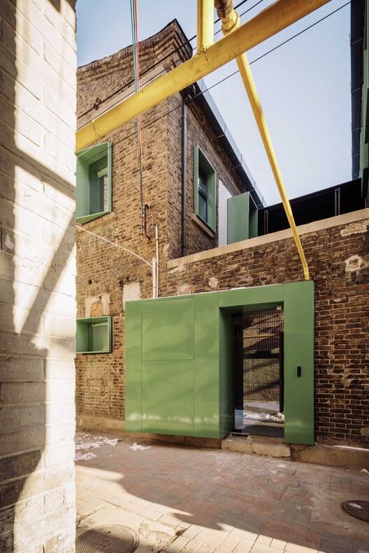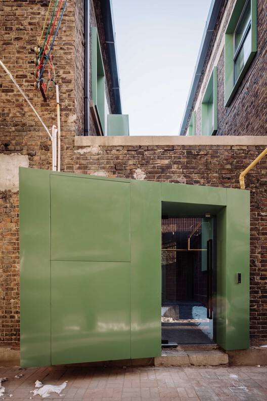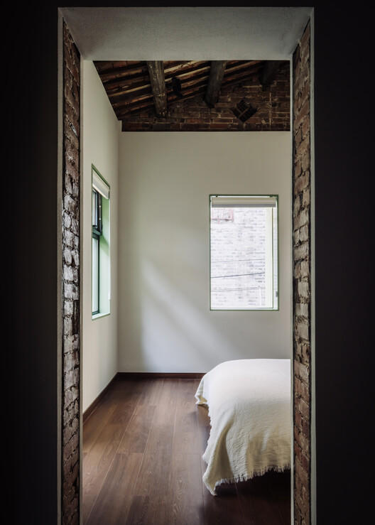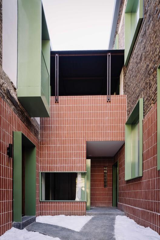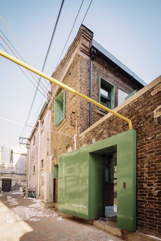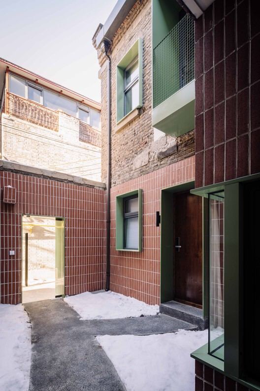 In terms of design, the design team focuses on showcasing historical clues in old buildings, using comparisons between new and old bricks and materials to continue expressing respect for history. At the same time, a window frame system beyond the usage boundary has been added, forming a new spatial expression. The dark green aluminum window frames float in the courtyard, emphasizing the boundary between interior and exterior space, while giving the building a modern feel. The second floor terrace retains the wooden form of the original roof and creates a space under the roof that can interact with the yard.