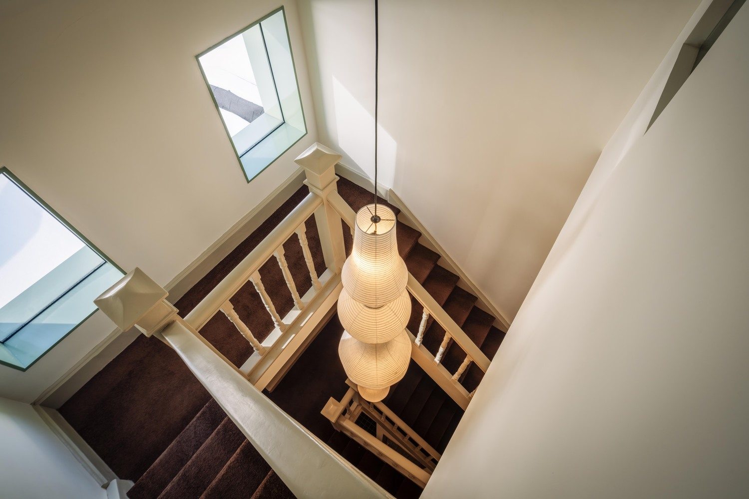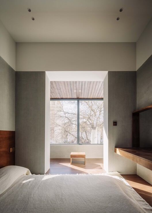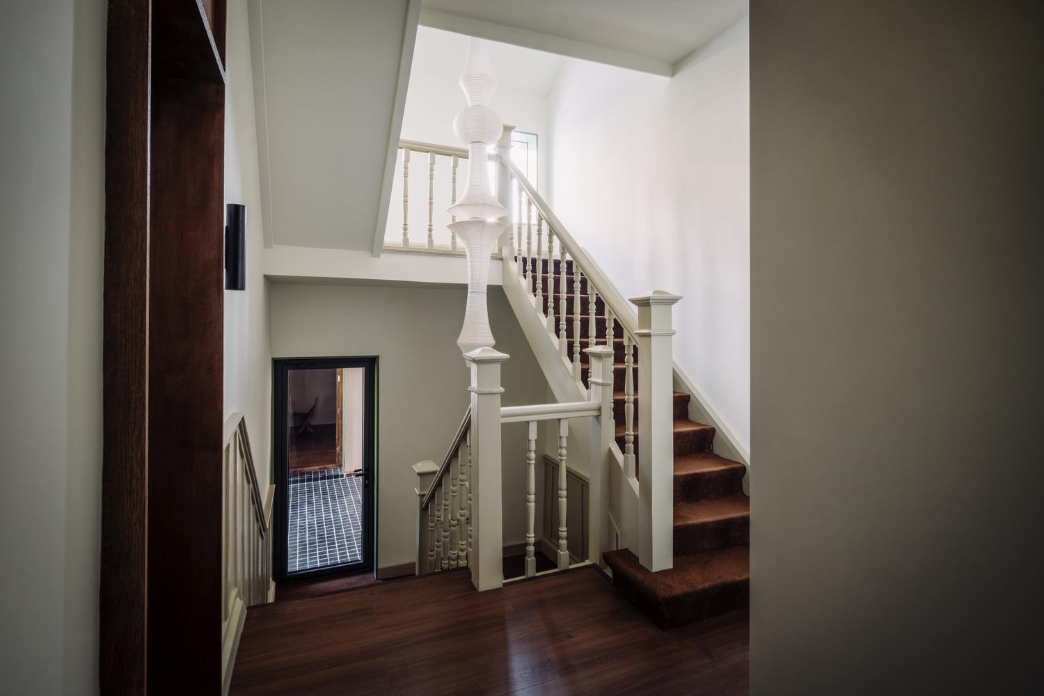 内部空间的叙事性与功能性: 内部空间的设计从朴素的日常角度出发,既满足了目标客户群的需求,又最大限度地保留了原建筑的材料和工艺,体现了设计者对空间使用者的深刻理解。裸露的墙体结构和屋顶,记录着建筑的历史痕迹,营造出一种独特的氛围感。而保留原有楼梯的设计更是妙笔生花,将其打造成为视觉焦点,并在楼梯的攀爬过程中,通过开窗设计,巧妙地将外部的历史建筑和现代城市景观引入室内,丰富了空间的叙事性。这种设计手法使空间既有历史的厚重感,又兼具现代生活的舒适性,创造出一种引人入胜的体验。