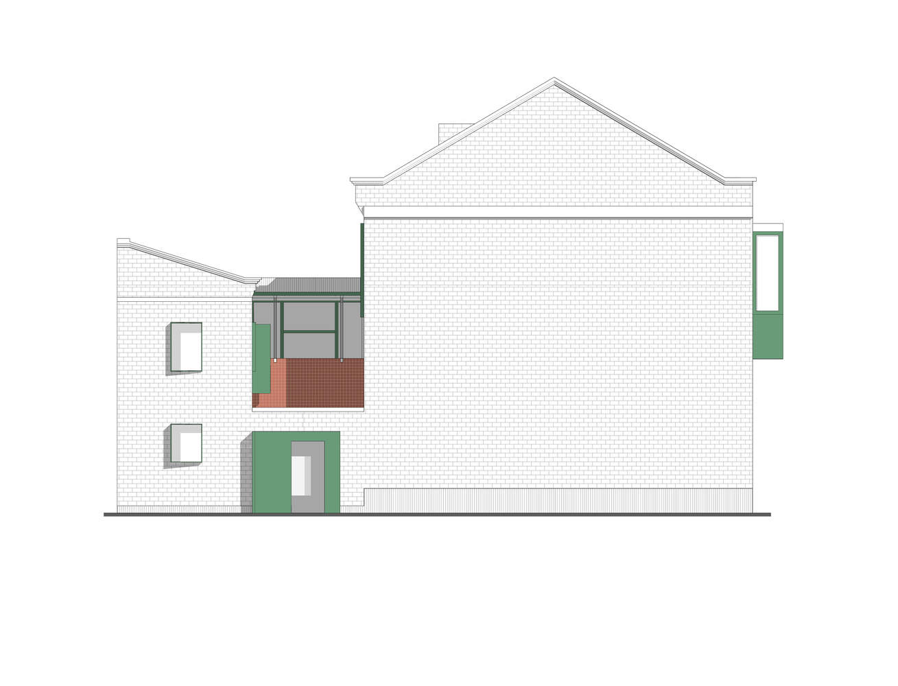 在设计上,设计团队注重展现旧建筑中的历史线索,用新旧砖的对比和材料延续表达对历史的尊重。同时,添加了一个超出使用边界的窗套体系,形成一种新的空间表达。墨绿色的铝板窗套漂浮在院落中,强调内外空间的界限,同时为建筑赋予了现代感。二层露台保留了原有屋顶的木构形式,并在屋顶下创造了一个可与院子互动的空间。