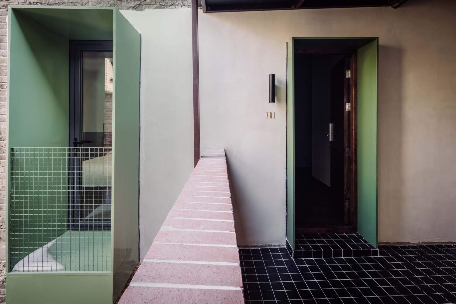 入口的策略与空间的对话: 建筑师巧妙地利用体量对比,打破了狭窄街巷的视觉局限,强化了入口的辨识度,这体现了对实际运营需求的精准把握。更重要的是,设计师在入口处设置的“反差感强烈的体量”不单是功能性的外壳,更是与内部院落空间对话的媒介。它强化了空间的层次感,引导视线,预示着内部空间的丰富性。这种设计手法不仅解决了商业展示问题,更以一种引人入胜的方式邀请人们进入,激发了人们对内部空间的探索欲望。入口设计是整个项目的点睛之笔,为后续的改造奠定了基调。