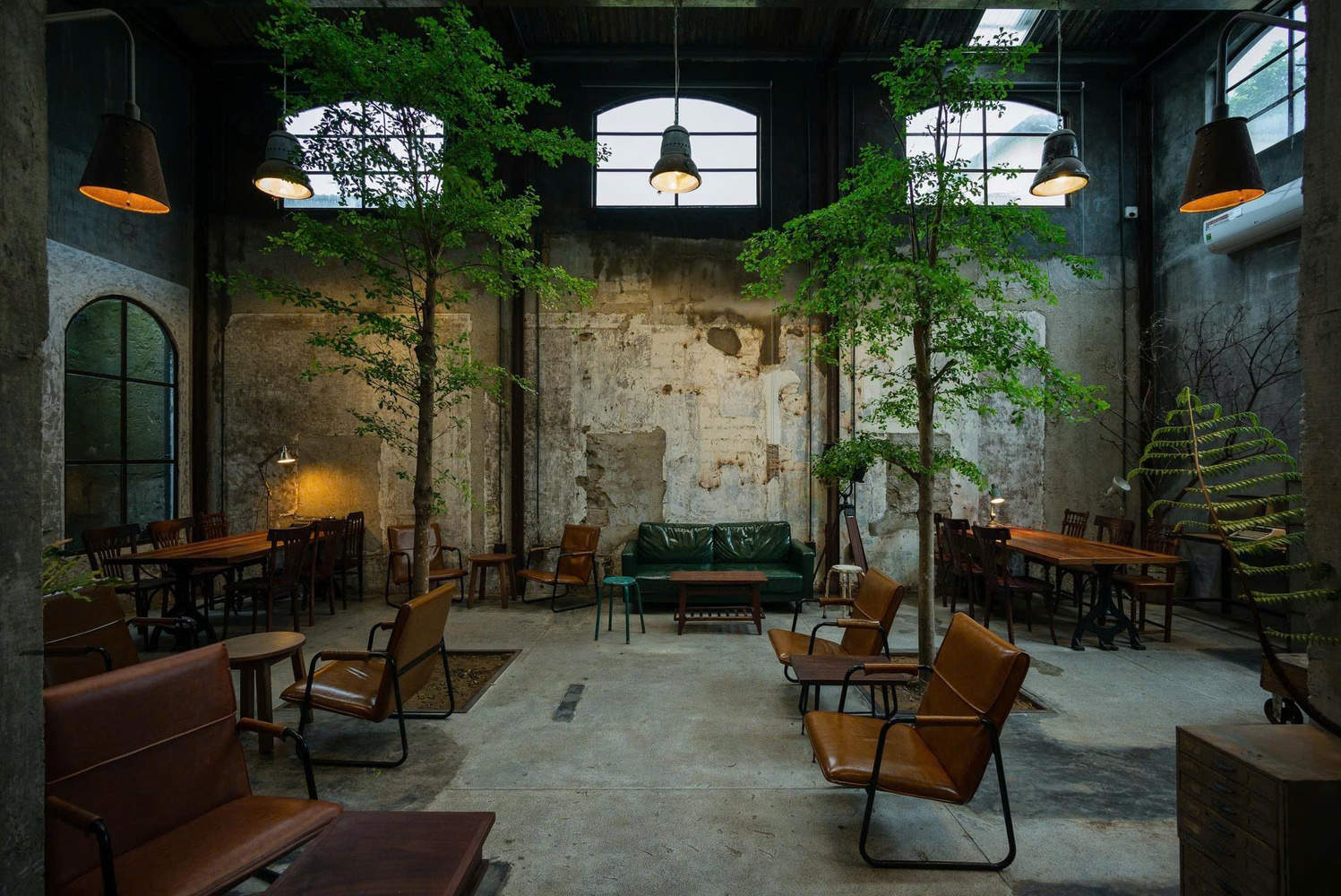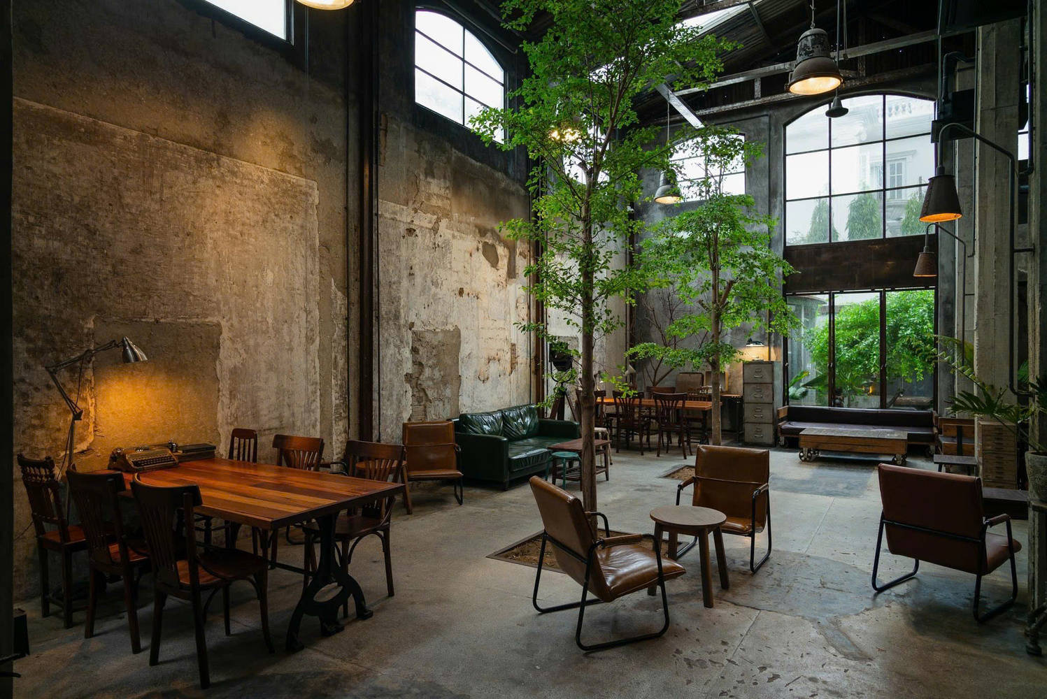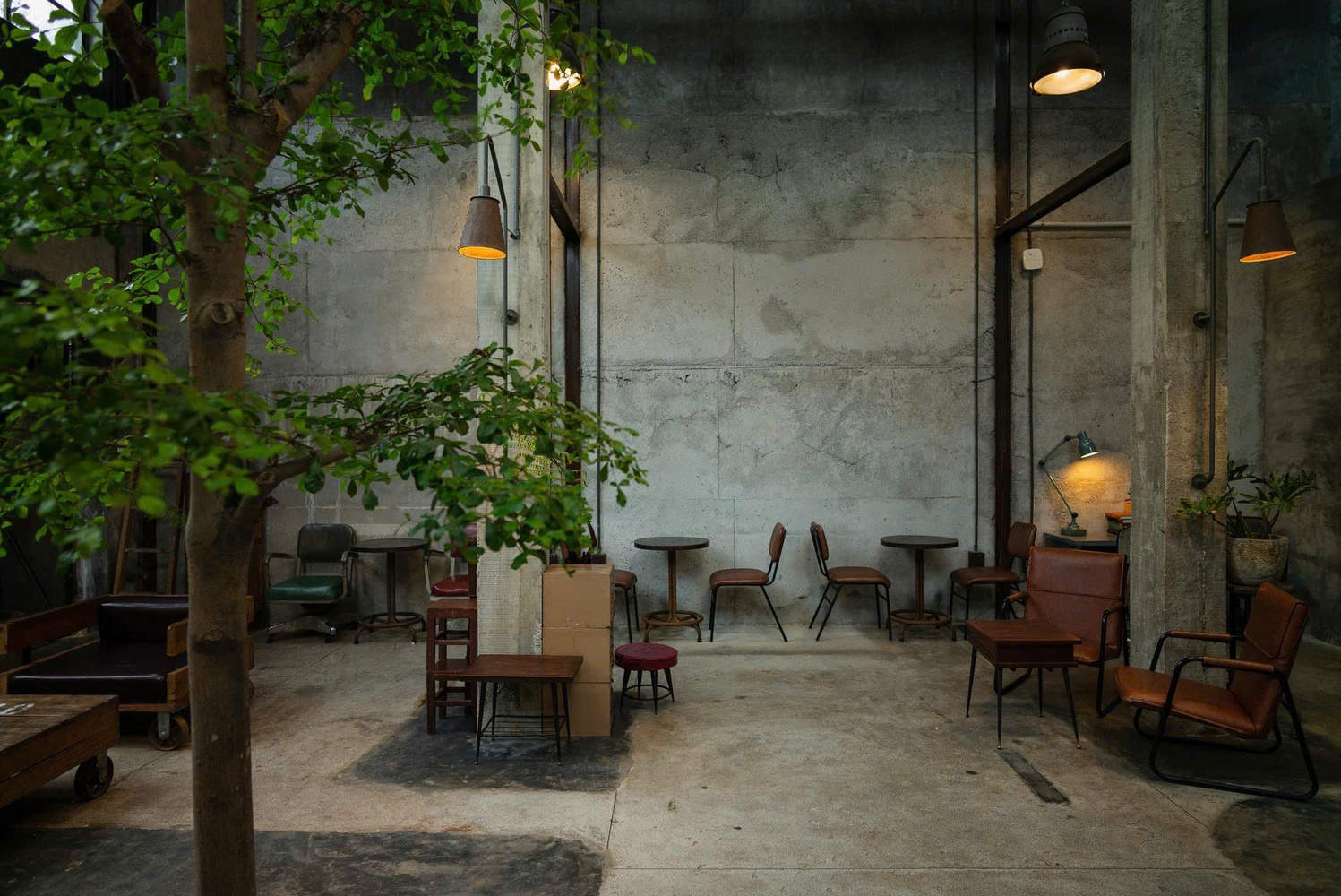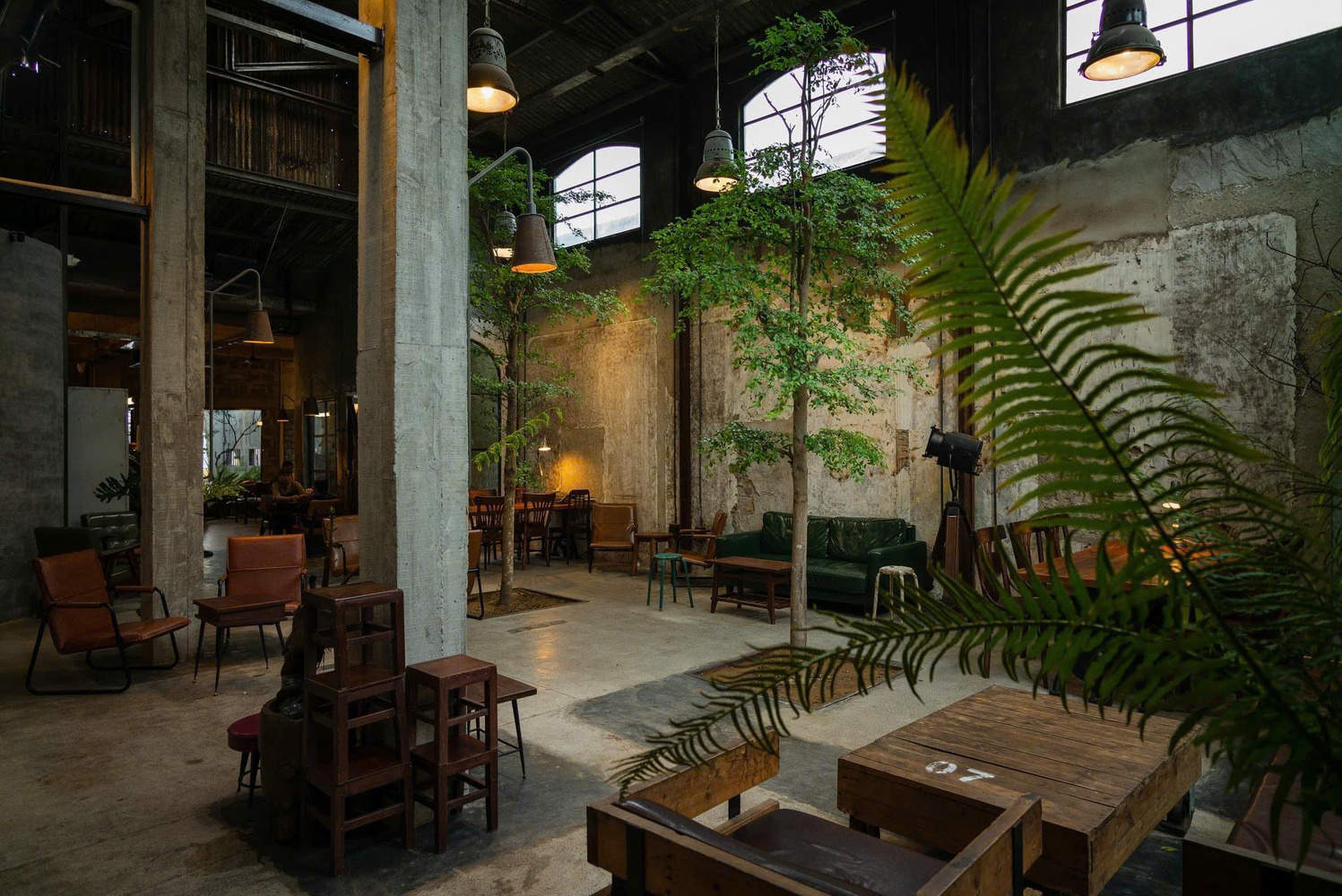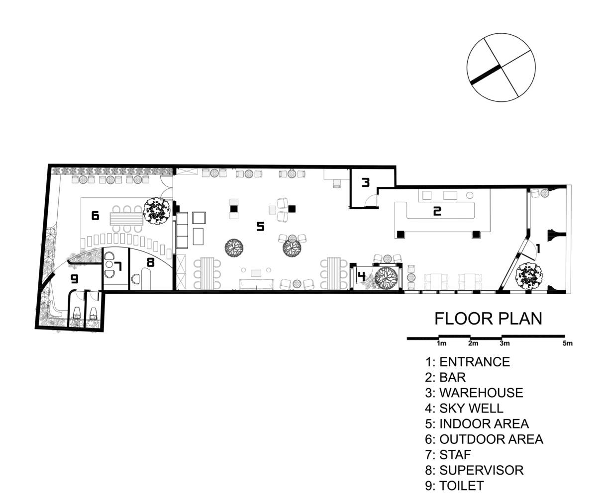 The bar counter is located at the entrance, close to the main door, for the convenience of customers. The office area, storage room, and bathroom are located at the back of the building, and another indoor garden is also set up at the back as the main green space of the entire building. The main materials used include concrete walls and ceilings, steel, glass, and recycled wood. The furniture adopts an industrial style design, which complements the overall architectural style.