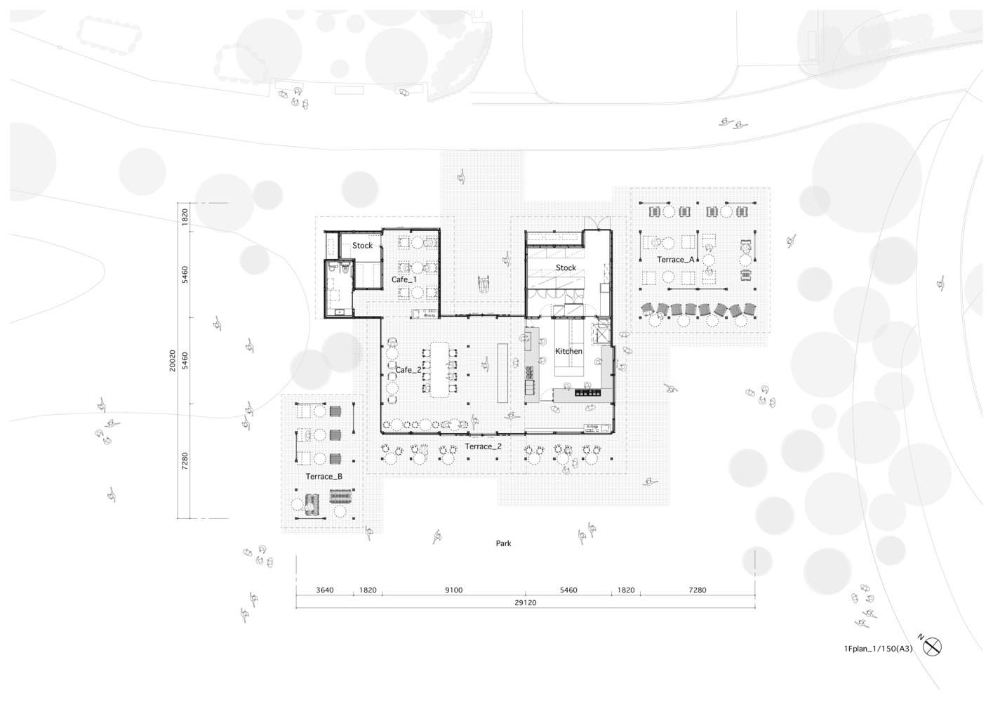 The project requires a caf é of approximately 300 square meters, but we believe that a large building may significantly separate indoor and outdoor spaces in the park, disrupting the overall atmosphere of the park. Therefore, we have chosen a more open, friendly, and intimate space design that blurs the boundaries between indoors and outdoors, making the entire park seem like a part of a caf é.